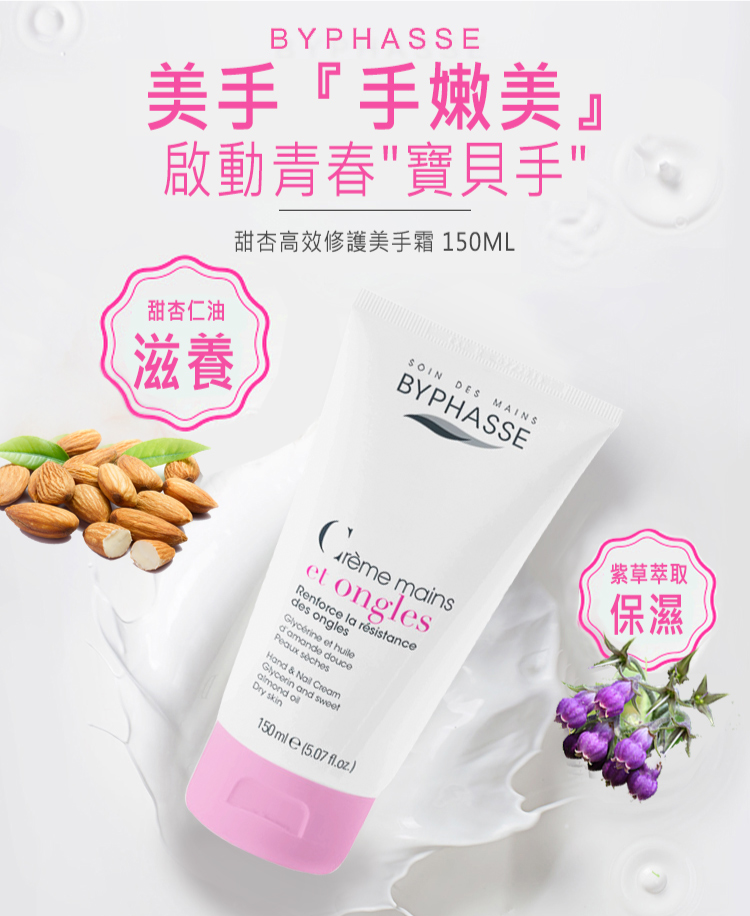 品牌:蓓昂斯 BYPHASSE 品名:甜杏高效修護美手霜 容量:150ml |