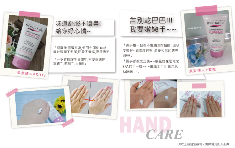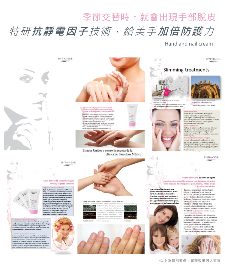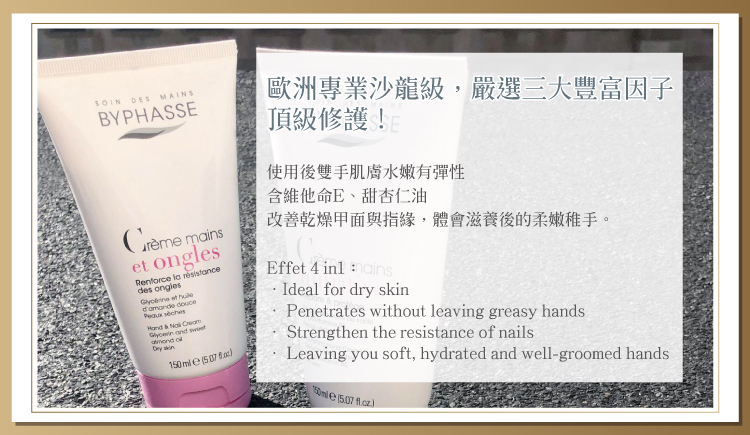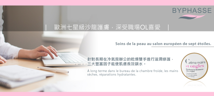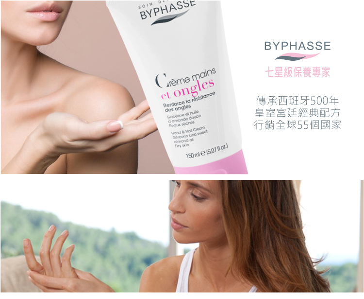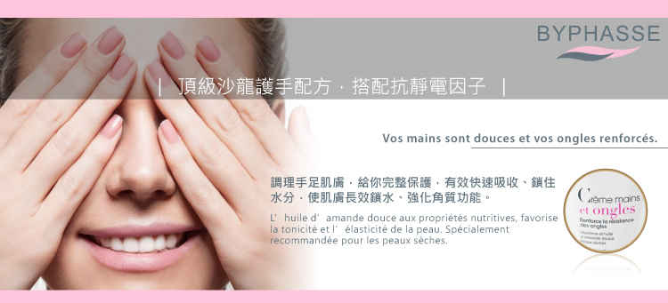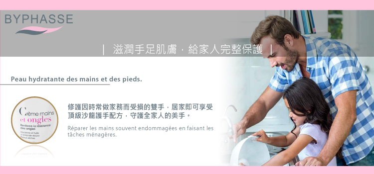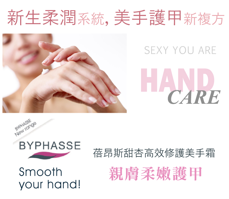 Byphasse蓓昂斯是歐洲七星級沙龍護髮護膚專業品牌,以專業人士的技術需求做為研發生產標準製造,是全球首屈一指的沙龍專業系列品牌。針對上班族常使用電腦手機/媽媽做家務的主婦手特研新複方技術:新生沁潤系統(保濕防燥+滋養親膚+調理抗裂), 瞬間達到絕美雙手的效果。 |