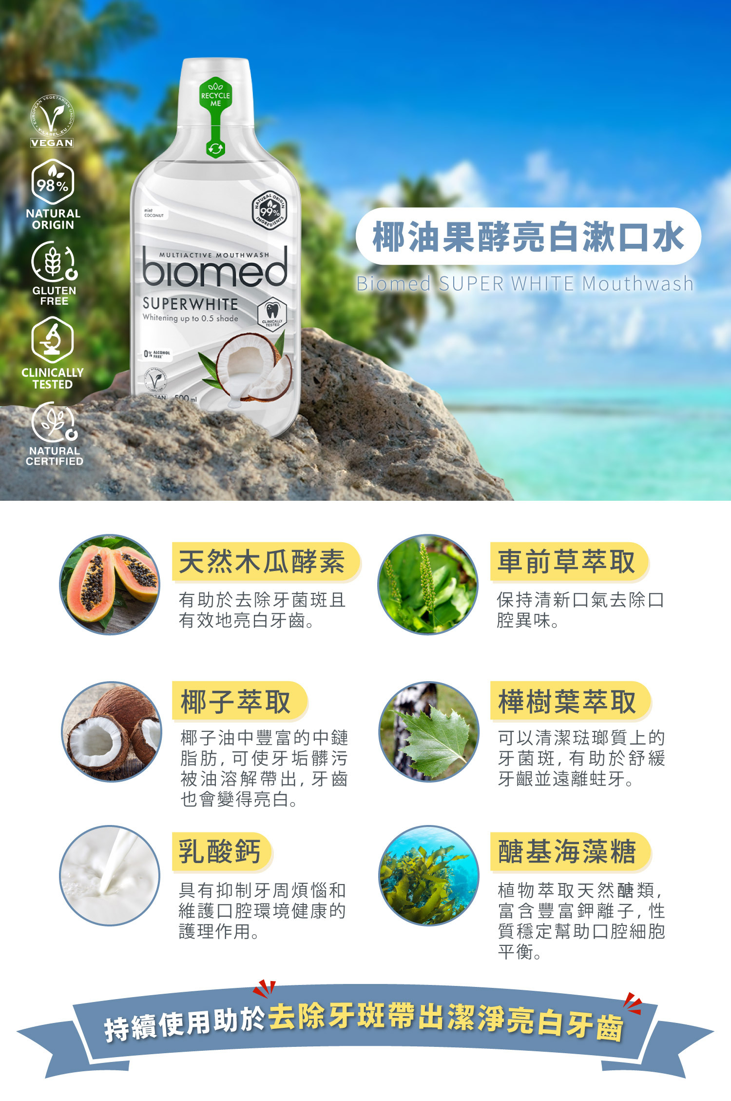 | 產品規格 | 品牌:Biomed 品名:椰油果酵亮白漱口水 容量:500ml |