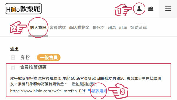 前往「商店前台 > 會員中心 > 個人資訊」,找到「會員推薦優惠」區塊,點按「複製連結」,即可成功複製會員推薦連結。