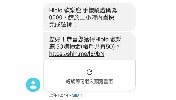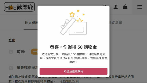 註冊成功後,畫面會彈出獲得$50購物金的通知。