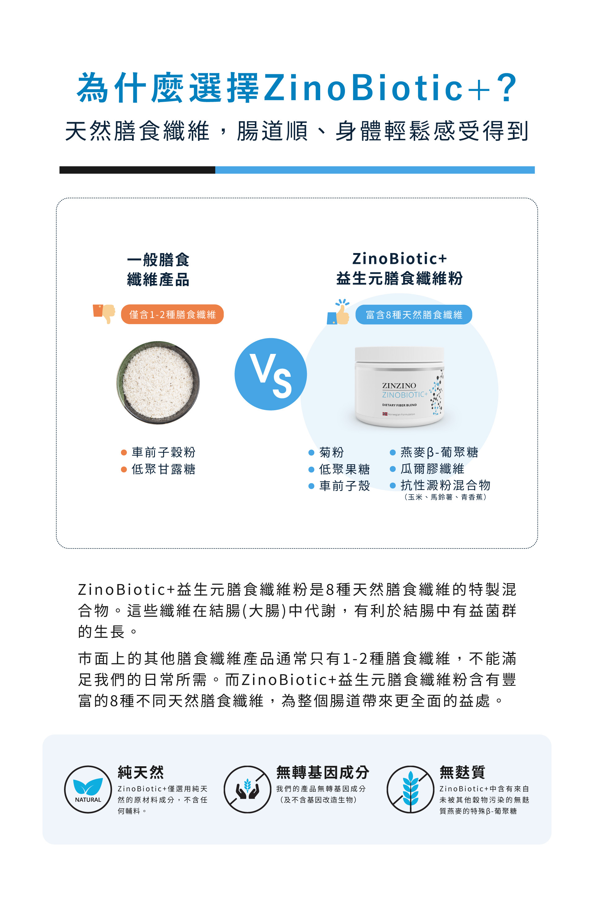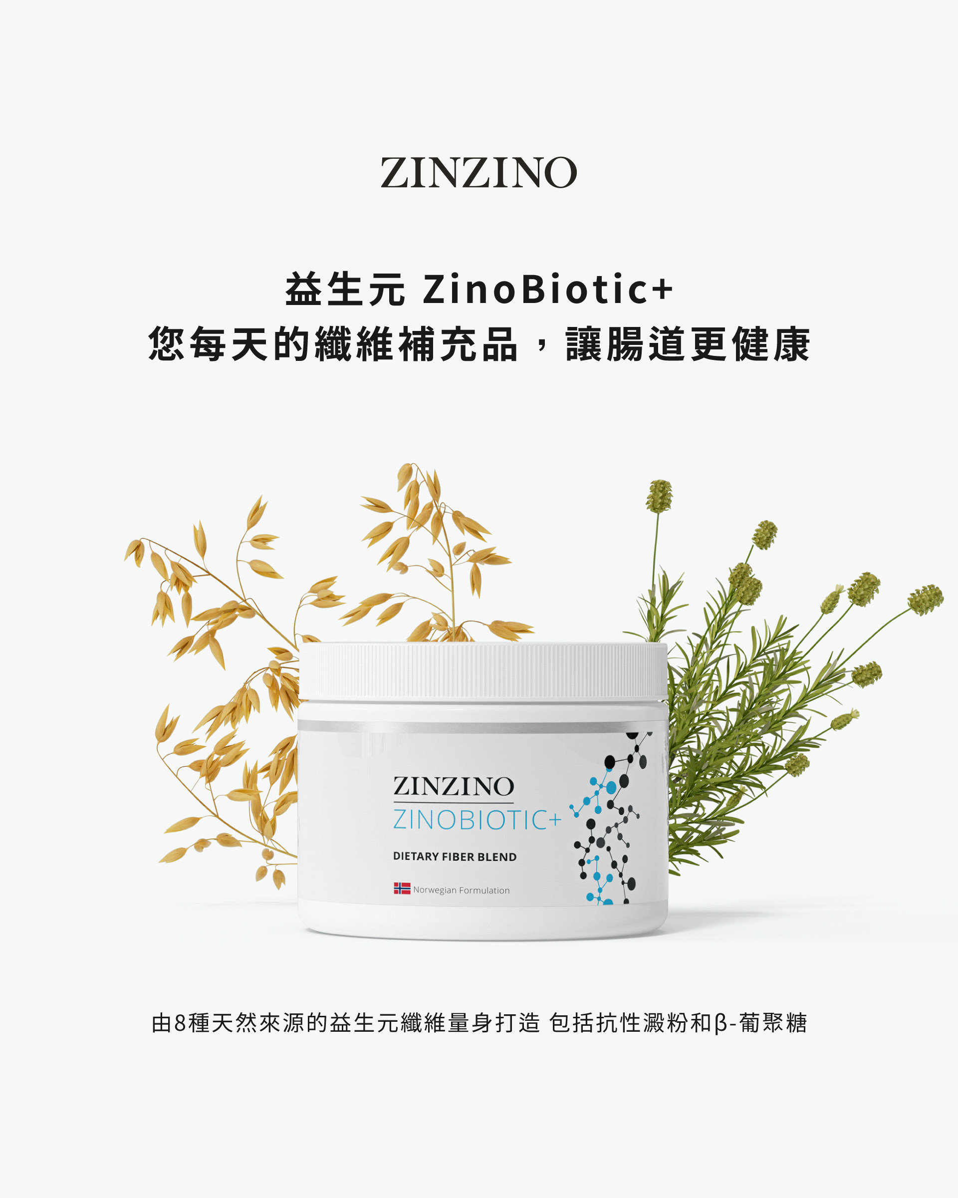 | 產品特色 | 現代人三餐外食、蔬果攝取不足,容易讓你感覺不適或精神不濟。其實,這些問題與腸道菌叢失衡、膳食纖維攝取不足密切相關。ZinoBiotic+ 為來自北歐保健品牌 ZINZINO 所研發的綜合型膳食纖維補充品,特別設計給飲食不均的現代人。富含八種天然來源膳食纖維,包括抗性澱粉、菊糖、果寡糖(FOS)、燕麥β-葡聚糖與洋車前子殼等,有助於維持腸道菌叢生態平衡、促進排便順暢與正常代謝機能。 |