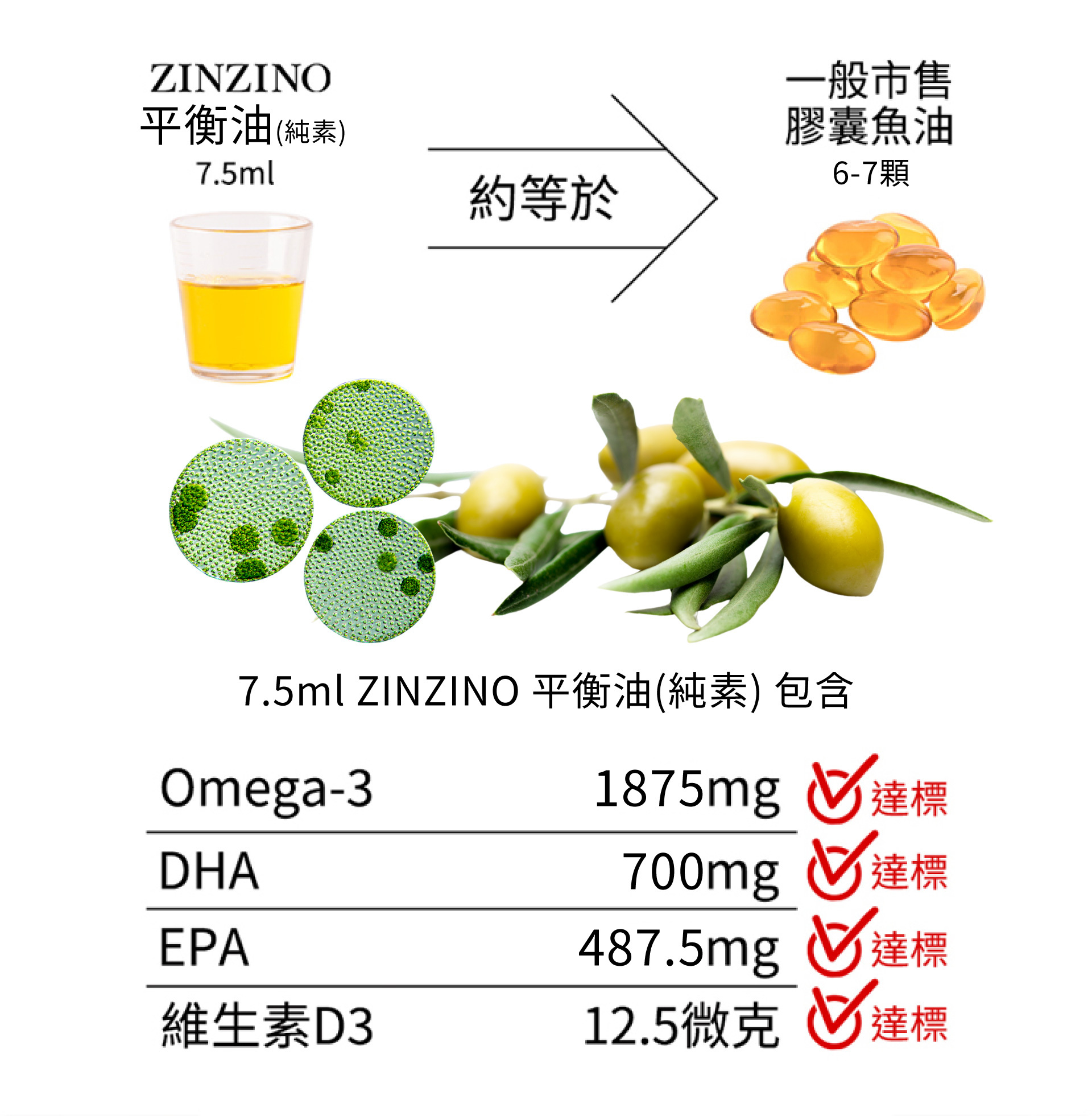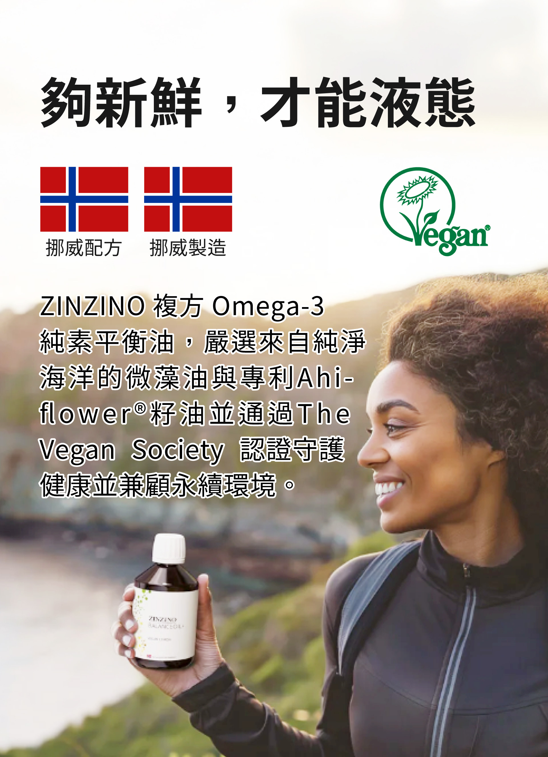 | 產品特色 | 想補充 Omega-3 又不吃魚?ZINZINO 素食魚油是專為純素或少魚飲食者設計的植物性營養補充品。以海藻油與 Ahiflower® 籽油為主要來源,提供 Omega-3 脂肪酸(EPA、DHA),並添加植物性維生素 D3、多酚與特級初榨橄欖油,適合現代人日常營養補給與保養。市面上第一款經純素協會認證、具有同等良好效果的植物性魚油替代品。海洋微藻油、特級初榨鮮採橄欖油、Ahiflower® 籽油和純素維生素 D3的全天然混合物。 |