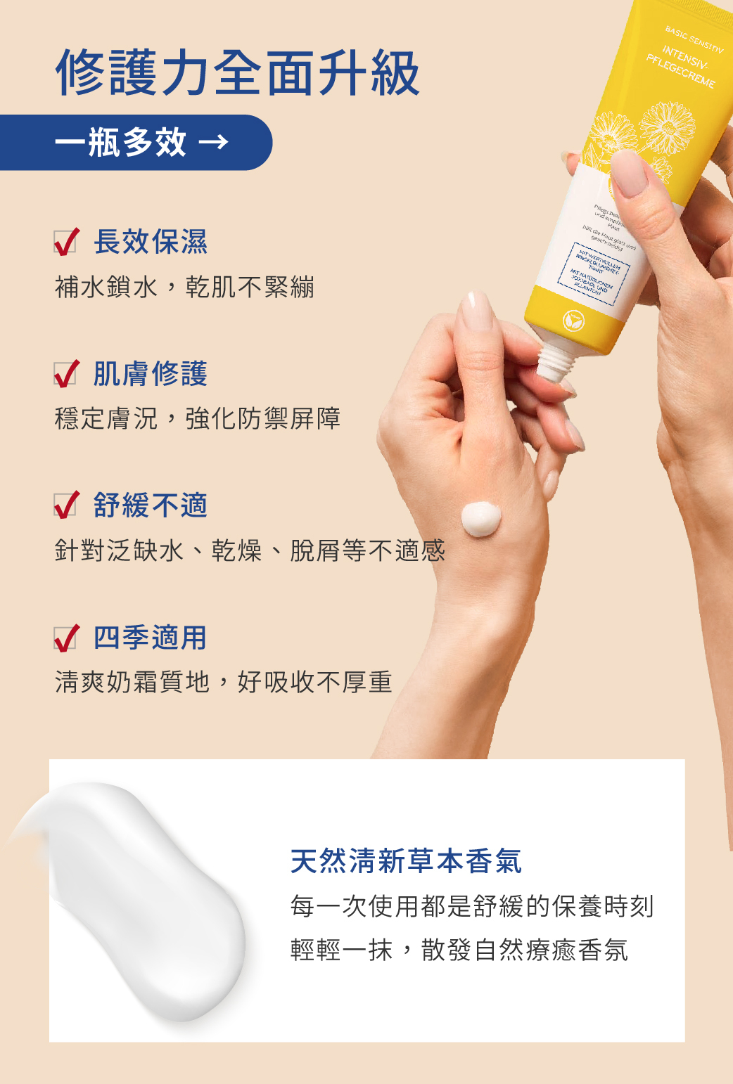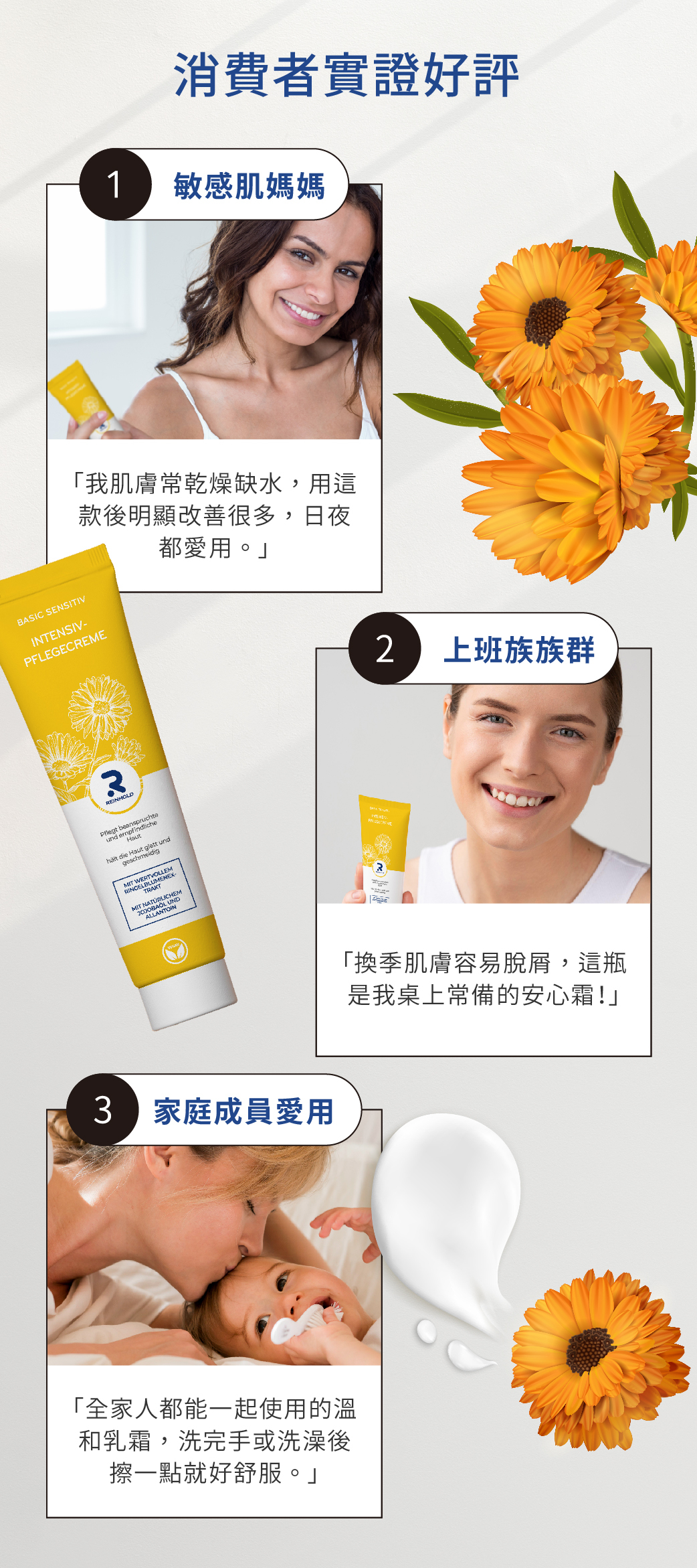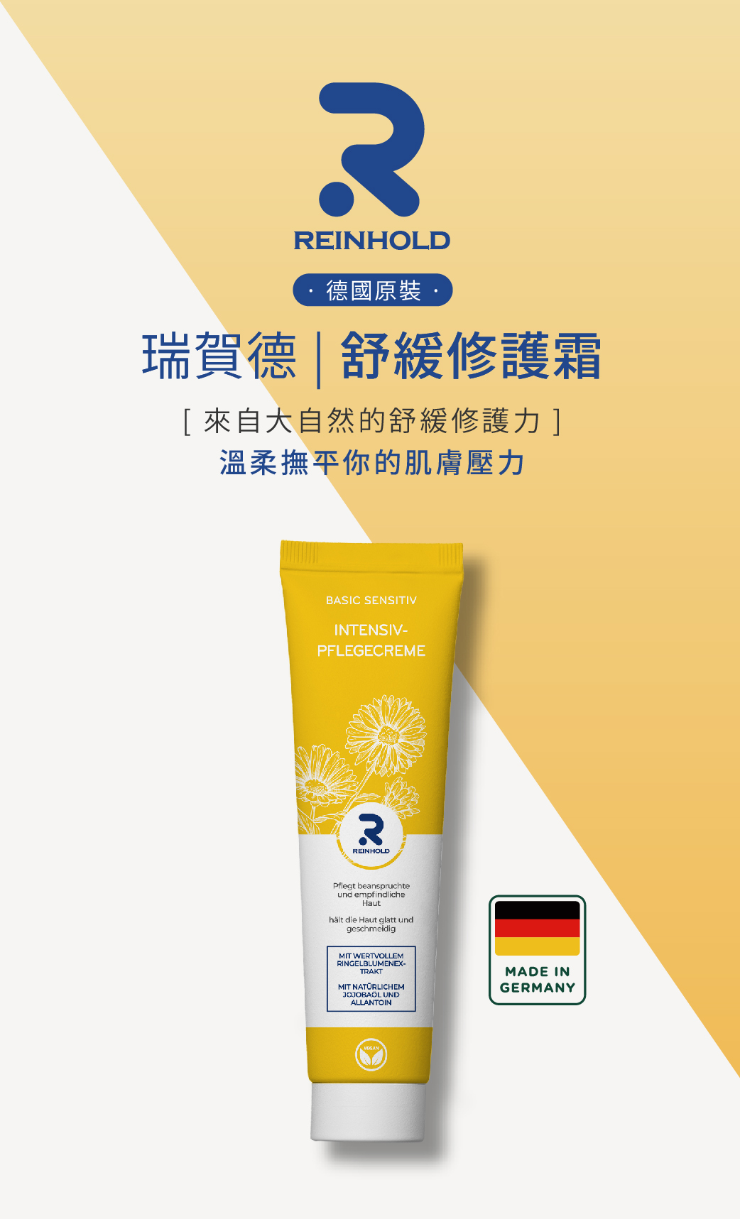 | 產品特色 | 德國REINHOLD瑞賀德舒緩修護霜,專為乾燥與敏感肌設計,添加金盞花植萃成分,質地溫和,適合日常肌膚保養使用。能協助維持肌膚水分,改善乾燥緊繃的不適感,同時提升肌膚對外在環境的保護力。質地柔潤不厚重,臉部、手部與身體皆可使用,適合全家日常護理。無論季節轉換、長時間待冷氣房或肌膚乾燥時,皆可作為基礎保濕與舒緩保養選擇。 |