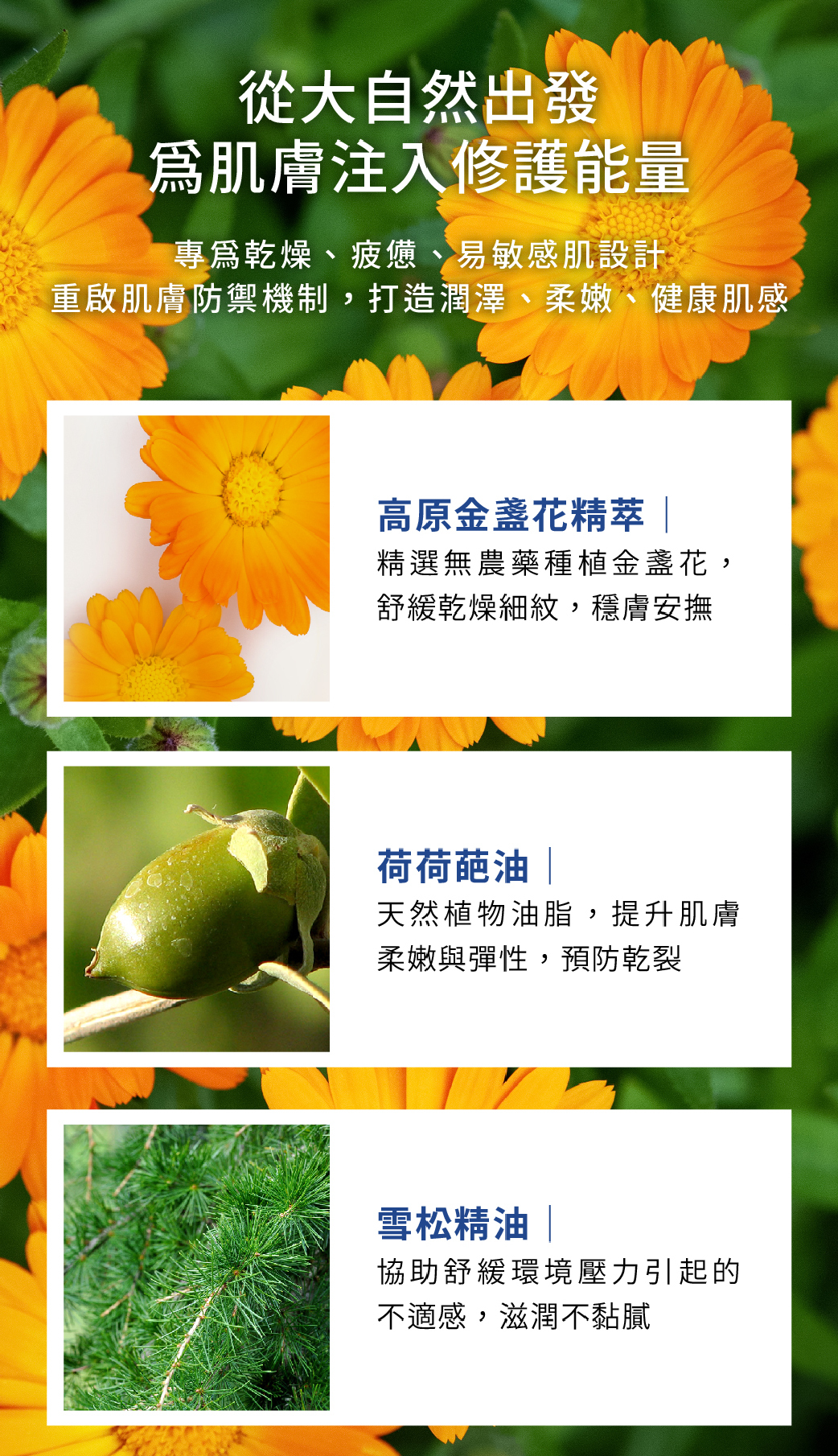 1.添加金盞花植萃,溫和親膚,適合日常基礎保養