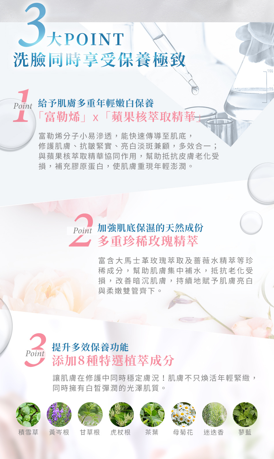 4.添加玫瑰精萃+8種植萃成分,洗淨同時給予肌膚保護及滋潤