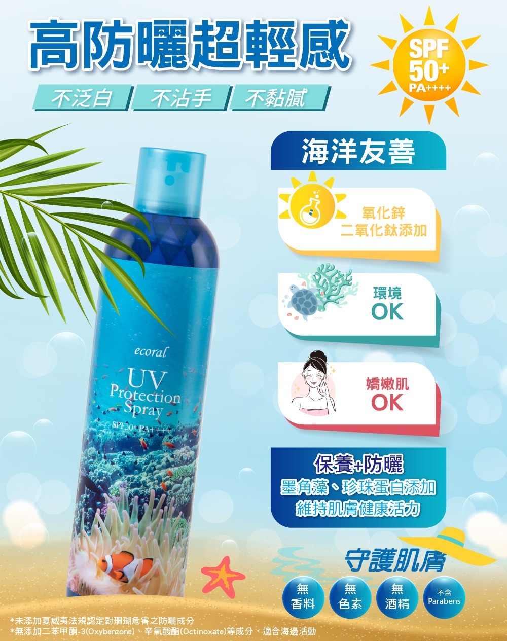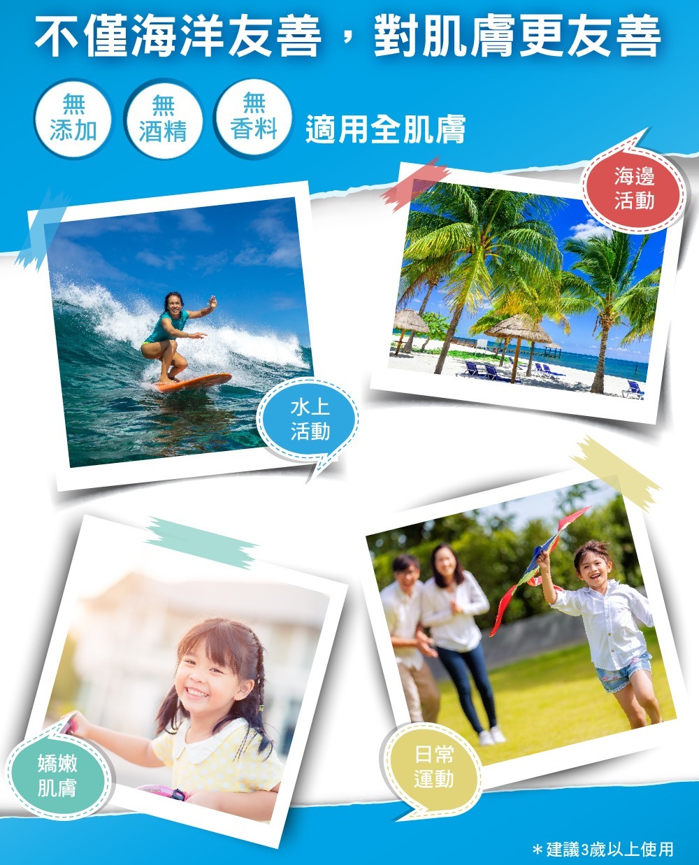 *無添加二苯甲酮-3(Oxybenzone)、辛氧酸酯(Octinoxate)等成分,適合海邊活動