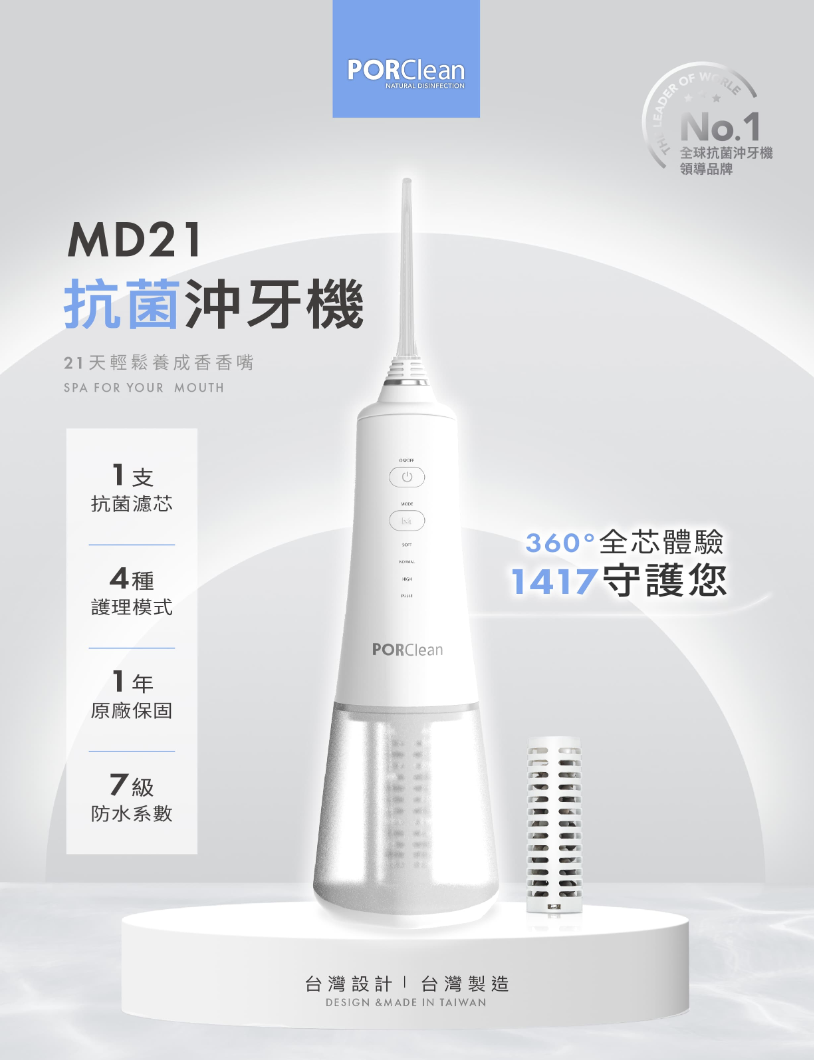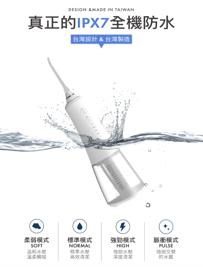 水療級韻律水柱,輕鬆沖出齒縫髒污,按摩牙齦、清除牙垢,不用剔、不用摳、不用括,潔牙超安心!經實驗證實,沖牙機改善牙齦炎效果比牙線高出52%,牙齦出血改善率更高2倍!手持款式搭配四段水壓調節,最強勁110PSI,深入牙縫徹底清潔!獨家Porcer寶磁抗菌濾芯,過濾壞菌、平衡酸鹼,守護全家口腔健康。IPX7防水,外出收納也安心,台灣製造,品質保證!每天沖牙,還原潔白笑容! |