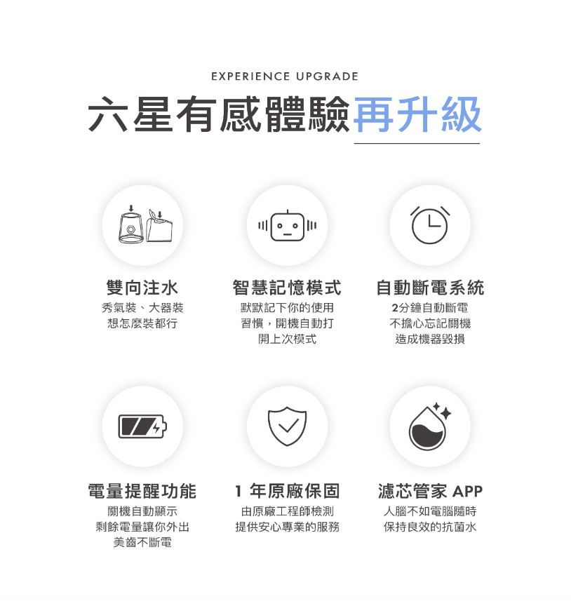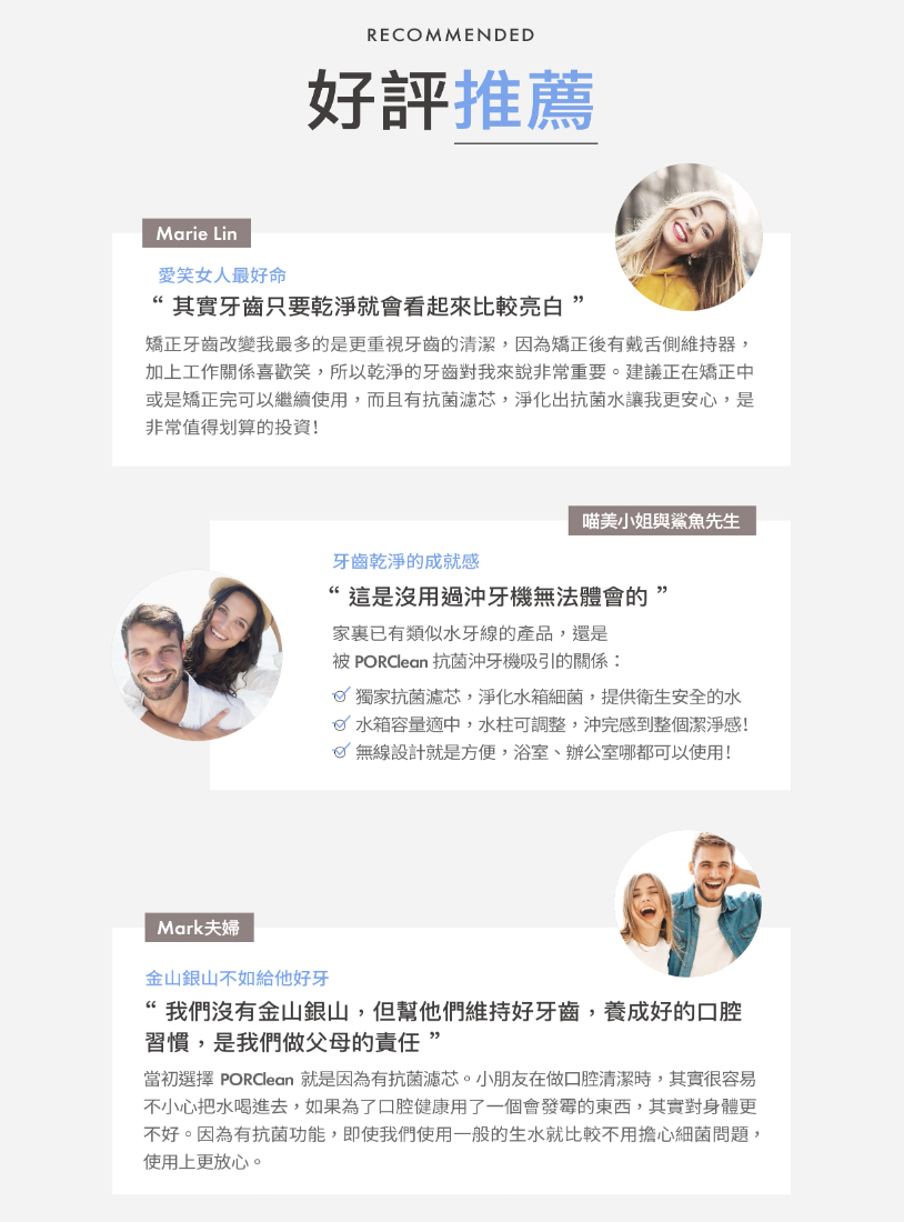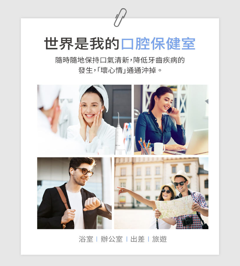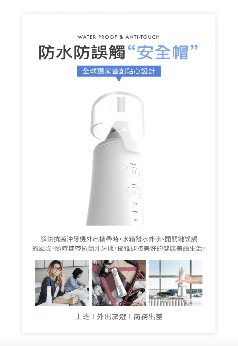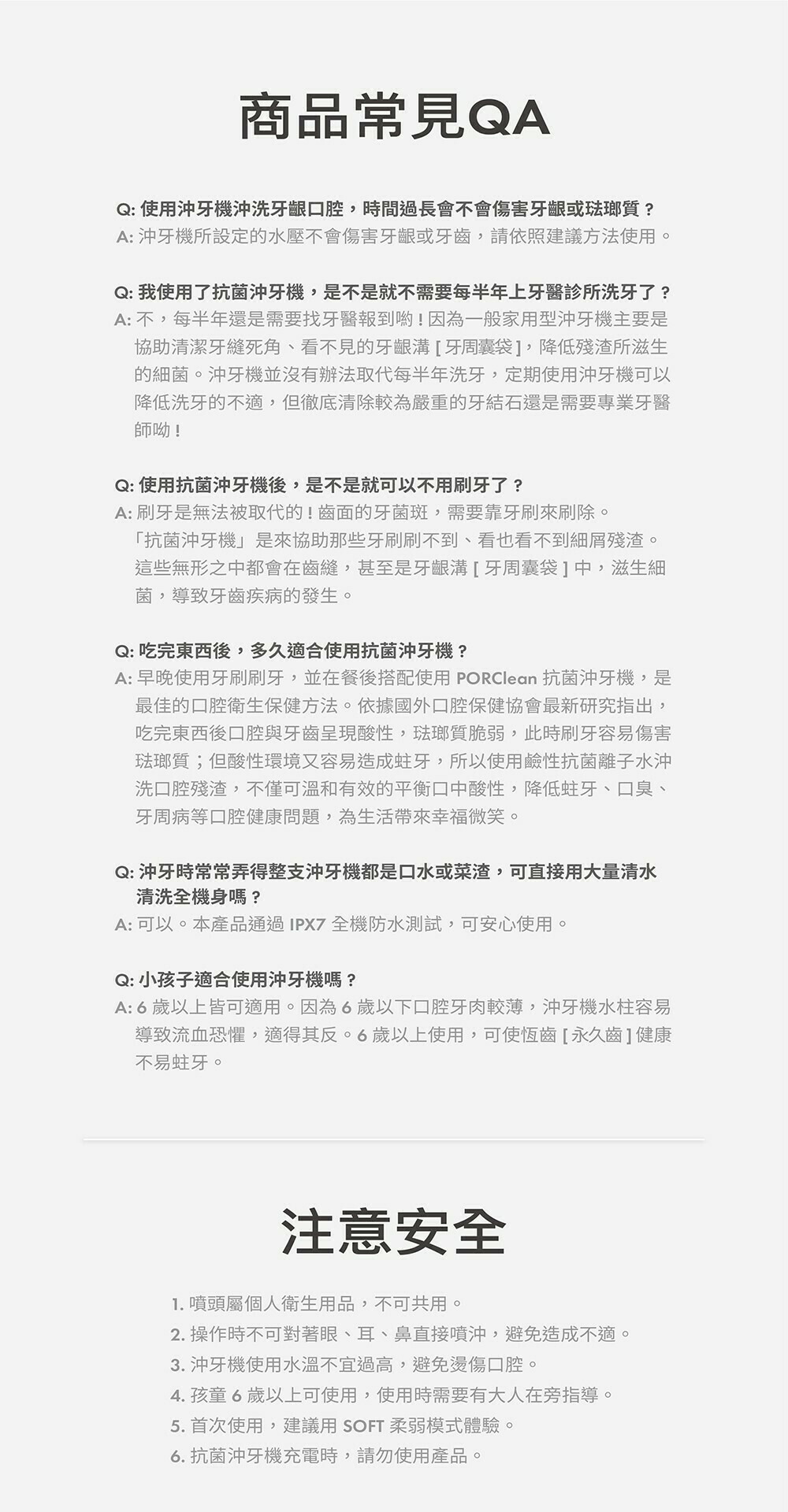 1.噴頭屬個人衛生用品,不可共用。 2.操作時不可對著眼、耳、鼻直接噴沖,避免造成不適。 3.沖牙機使用水溫不宜過高,避免燙傷口腔。 4.孩童6歲以上可使用,使用時需要有大人在旁指導。 5.首次使用,建議用SOFT柔弱模式體驗。 6.抗菌沖牙機充電時,請勿使用產品。 |