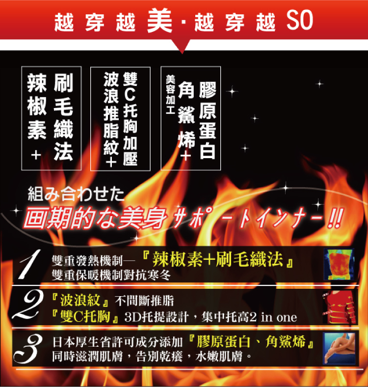 內刷毛保暖,額外添加辣椒素以及膠原蛋白除了保暖外還增添了潤滑肌膚之功效