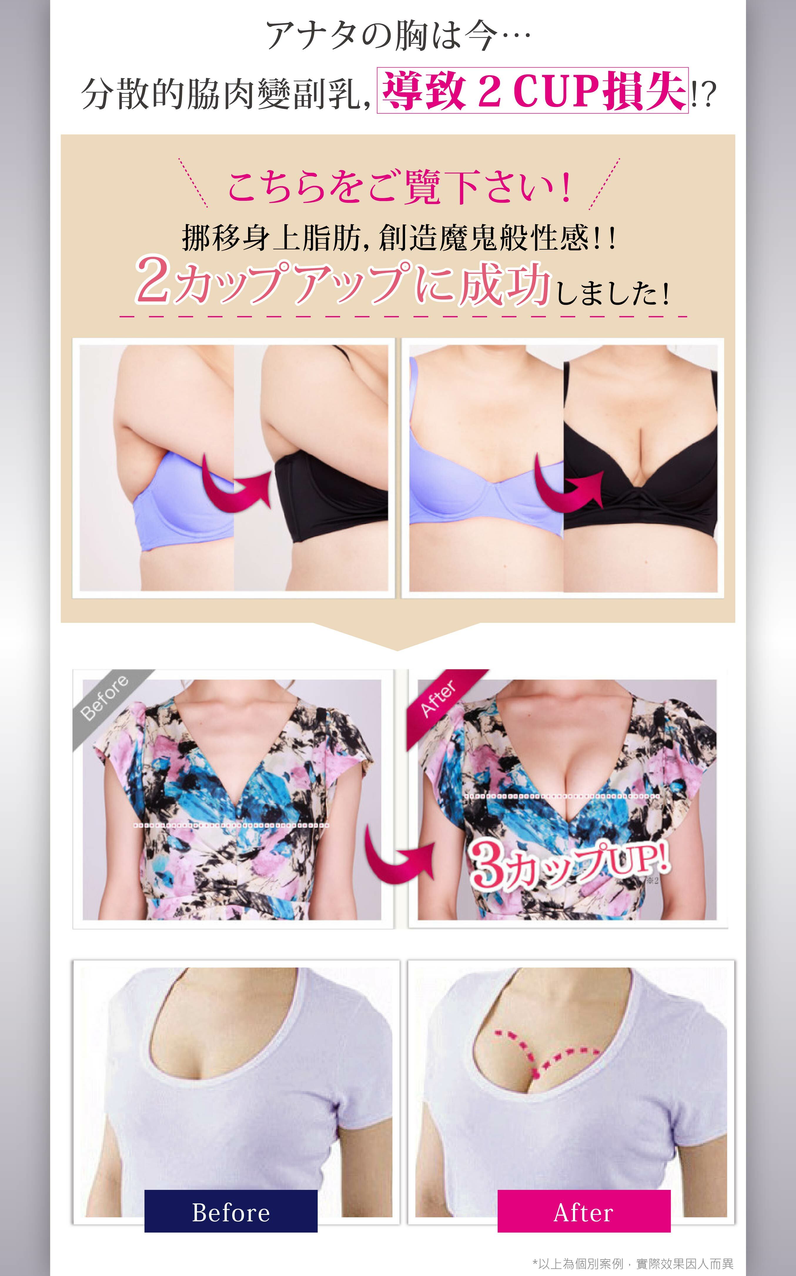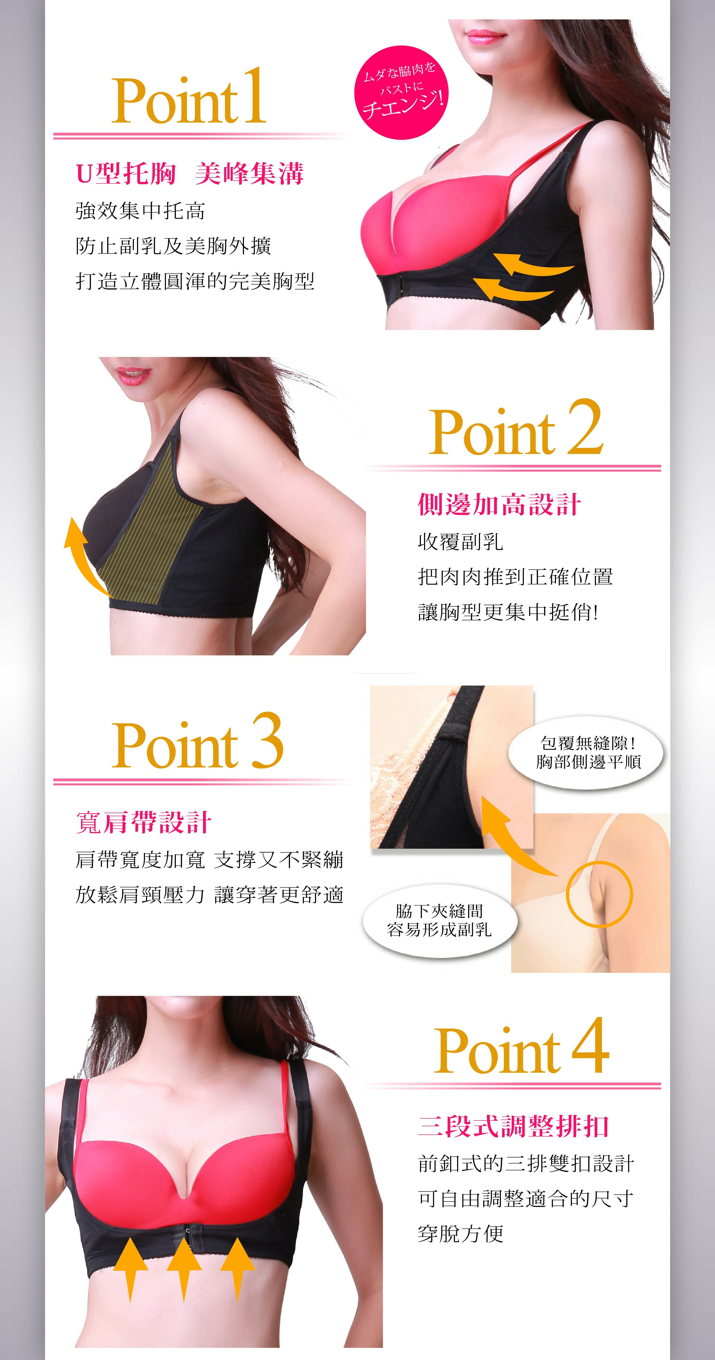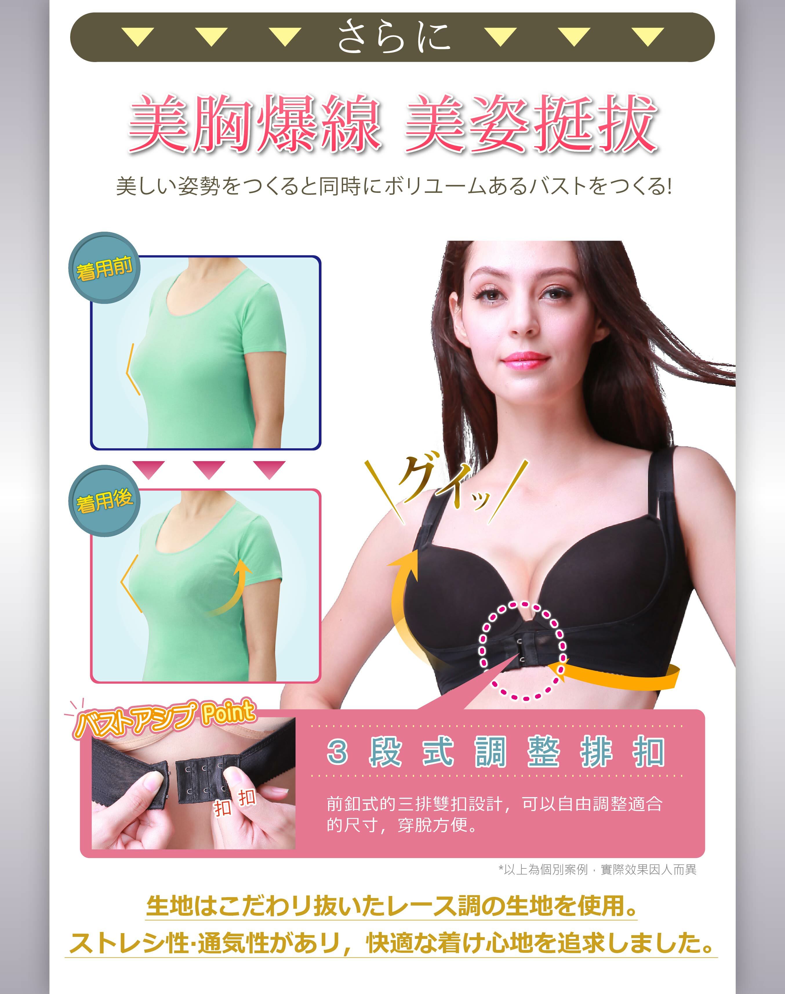 | 產品特色 | U型托胸,美峰集溝,強效集中托高,防止副乳及美胸擴,打造立體圓渾的完美胸型。側邊加高設計,收覆副乳,把肉肉推到正確位置,讓胸型更集中挺俏!寬肩帶設計,支撐不緊繃,放鬆肩頸壓力,讓穿著更舒適。三段式調整排扣,可自由調整適合的尺寸。 |