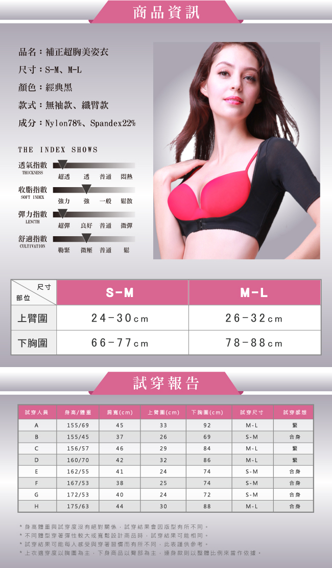 L 上臂圍(26~32cm)、下胸圍(78~88cm)