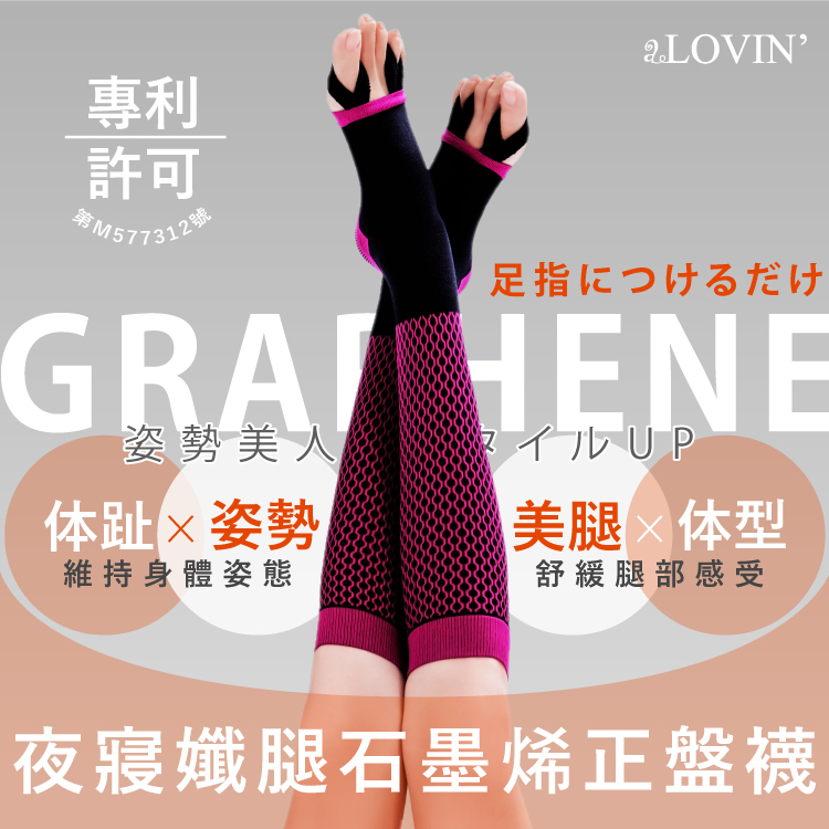日本專利「RS正盤趾環」補正重心、紓緩腳足,添加日本DamaYaki技術-石墨烯,加速腳尖循環,舒緩腿部感受;特殊鑽型3D編織,採用漸進式加壓,名膜美腿不是夢!