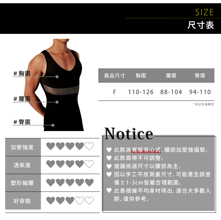 | 產品規格 | 品牌:婭薇恩 aLOVIN 品名:LUNABUTIY®型男勁爆衣 款式:寬版背心款 顏色:炫風黑 成分:NYLON78%、SPANDEX22% 尺寸:FREE SIZE 胸圍110-126cm,腰圍88-104cm,臀圍94-110cm ※ 建議挑選尺寸以腰部為主。 ※ 因以手工平放測量尺寸,可能產生誤差值±1-3cm,皆屬合理範圍。 |