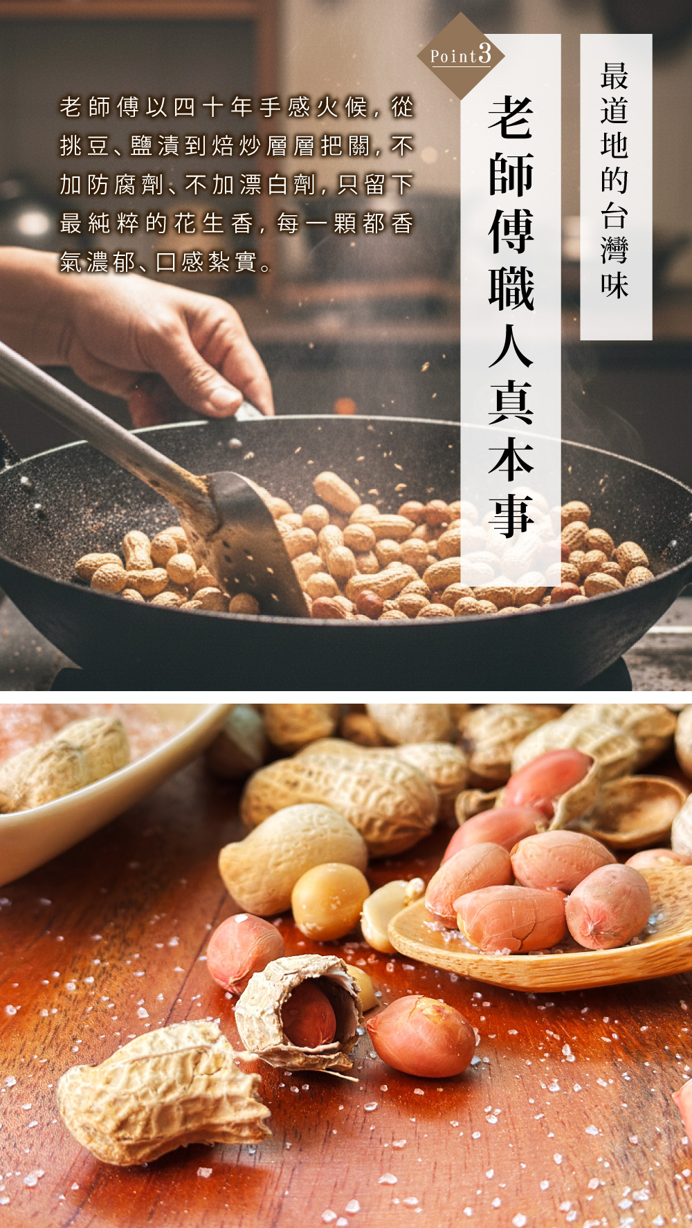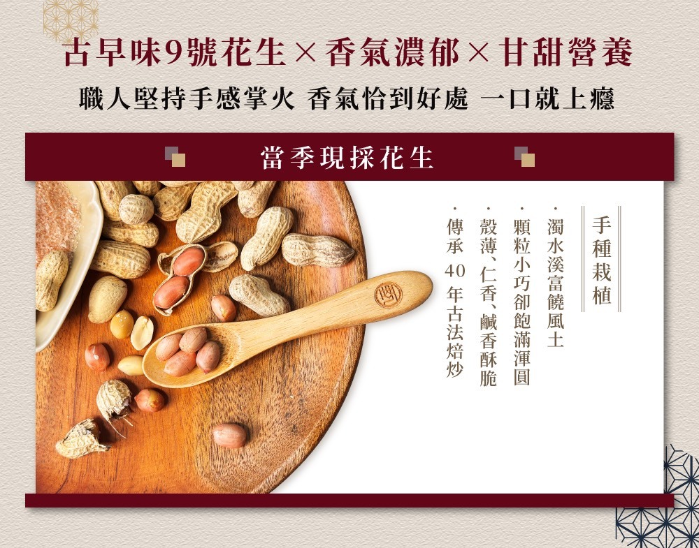 嚴選彰化契作在地「台9號花生」,小顆粒、殼薄仁飽滿,香氣特濃。老師傅以四十年手感火侯慢炒入味,保留最自然的香、最純粹的鹹,一口下去,直接回到記憶中的古早味時光! |