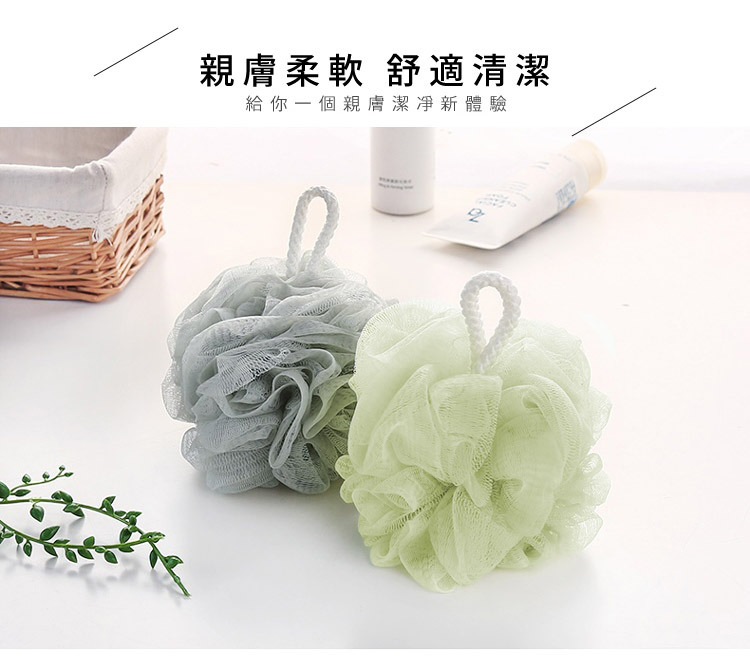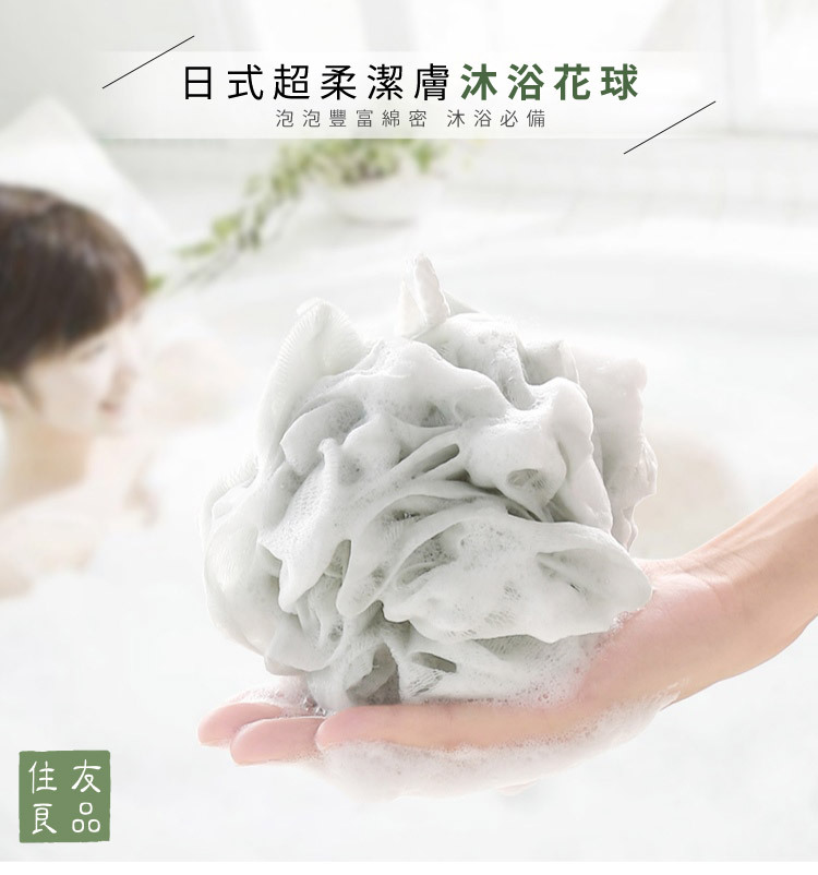 | 產品規格 | 品牌:住友良品 品名:日式超柔潔膚沐浴花球 顏色:果綠、冰藍 尺寸:12cm*12cm 重量:30g 材質:PE材質 |