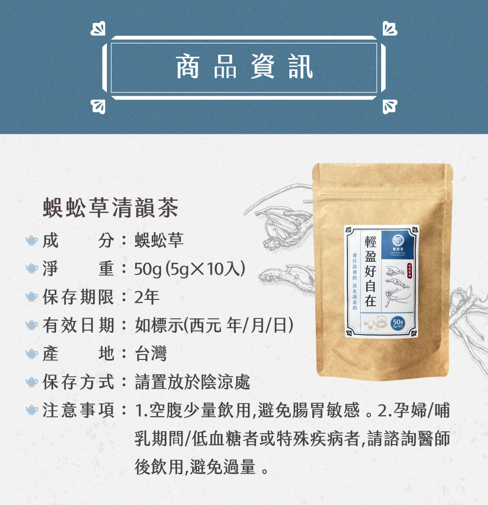 品牌:甄拾堂 品名:蜈蚣草清韻茶 淨重:5g*10入 成分:蜈蚣草 |