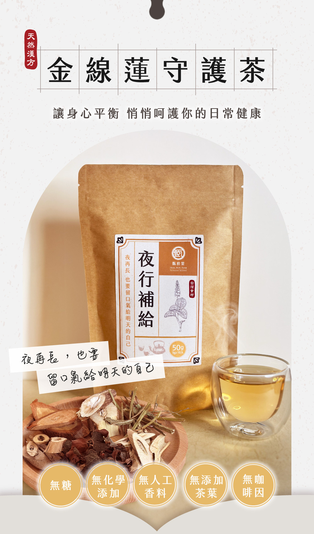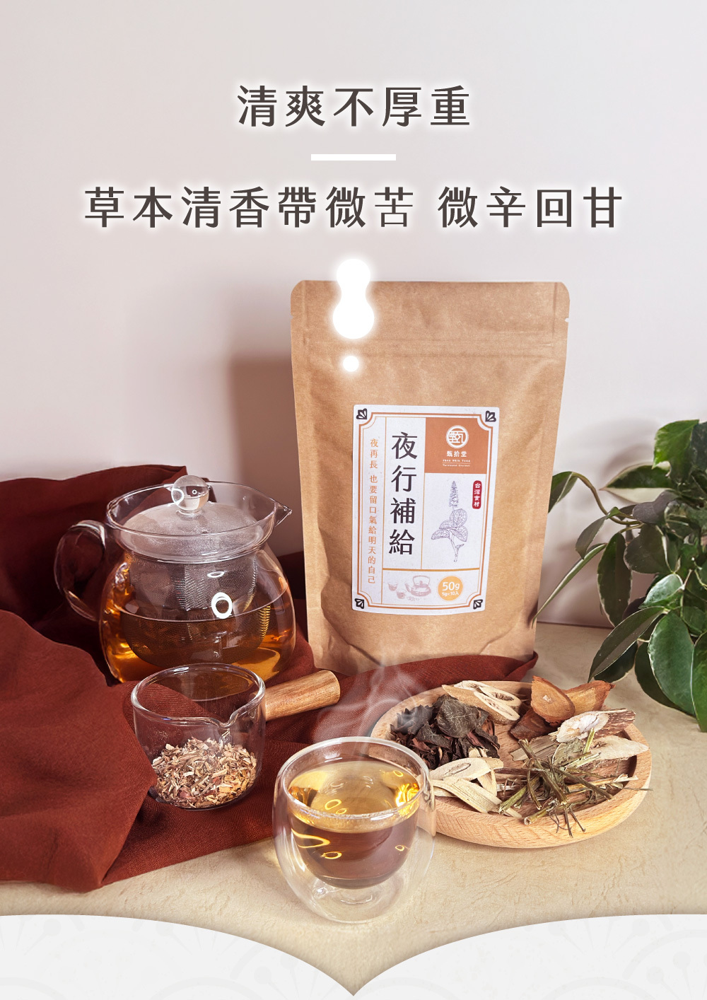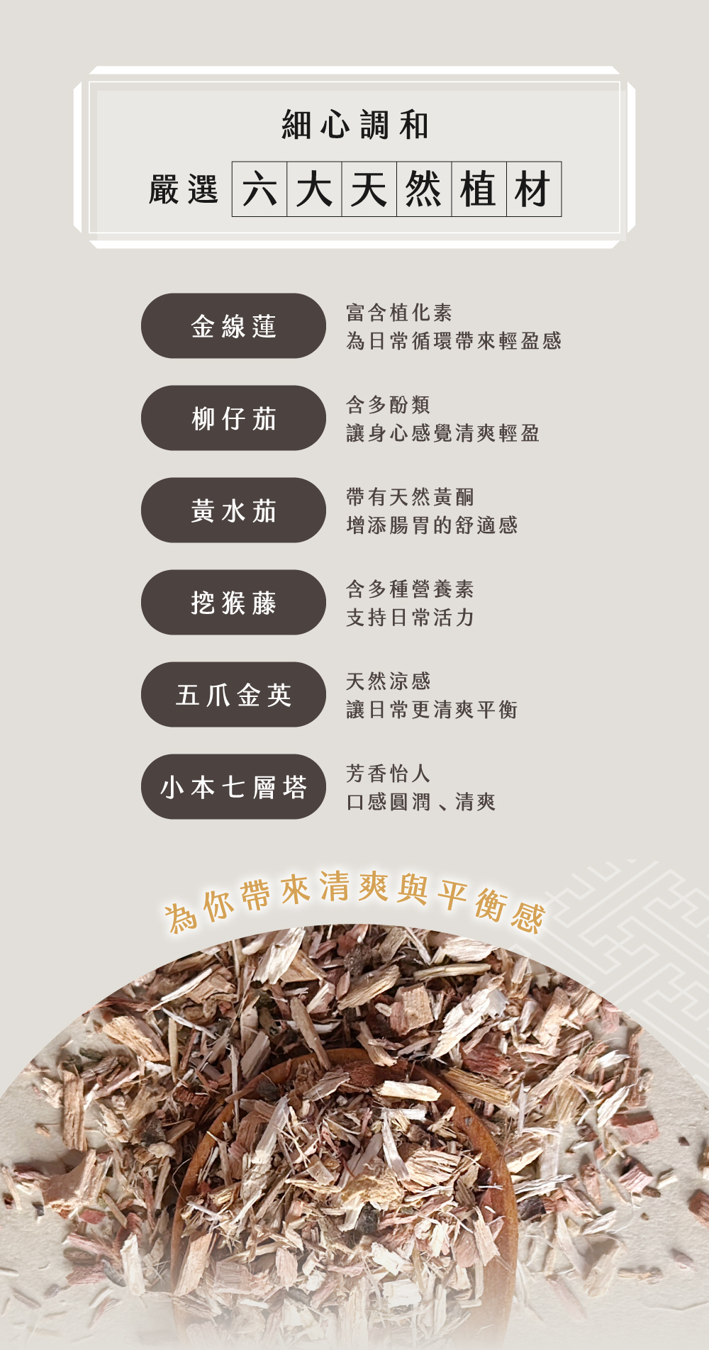 嚴選六大天然植材,細心調和,為你帶來清爽與平衡感,特別適合晚睡、應酬、常熬夜的現代人。茶湯帶淡淡草香,微苦回甘,尾韻清爽。 |