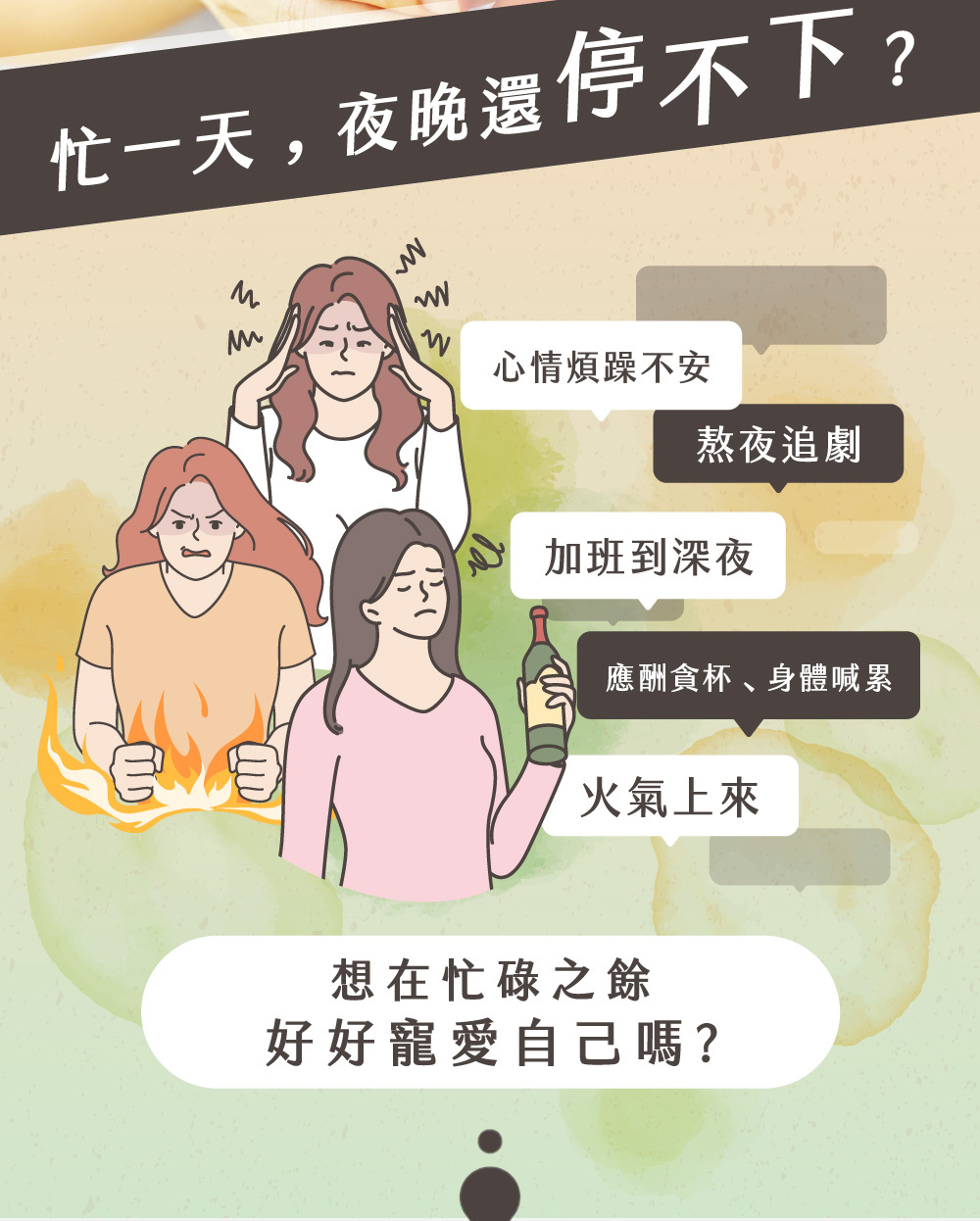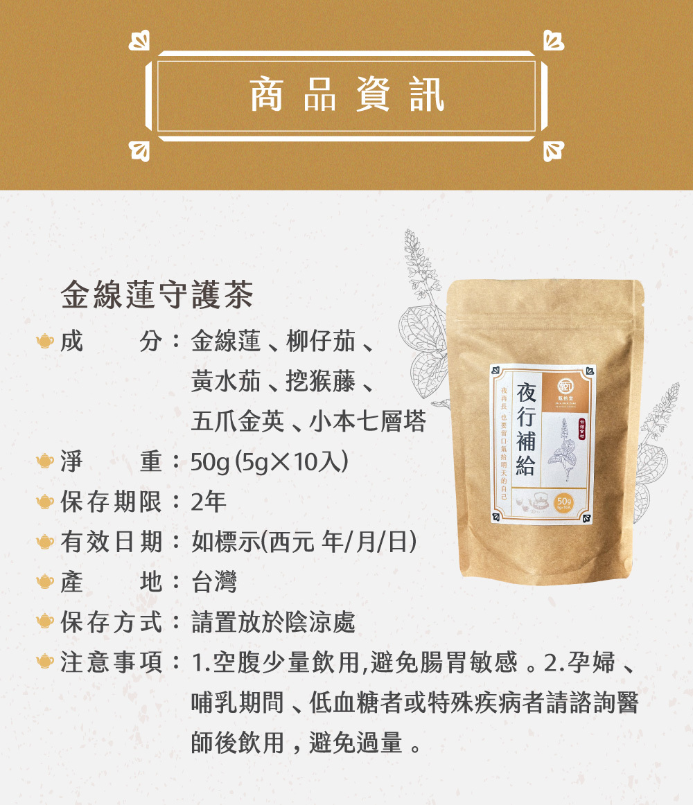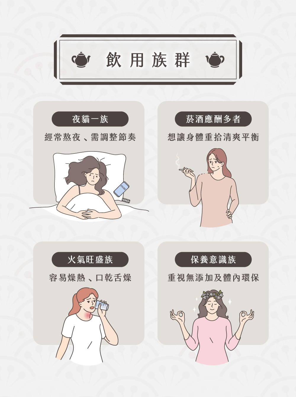 嚴選六大天然植材,細心調和,為你帶來清爽與平衡感,特別適合晚睡、應酬、常熬夜的現代人。茶湯帶淡淡草香,微苦回甘,尾韻清爽。 |