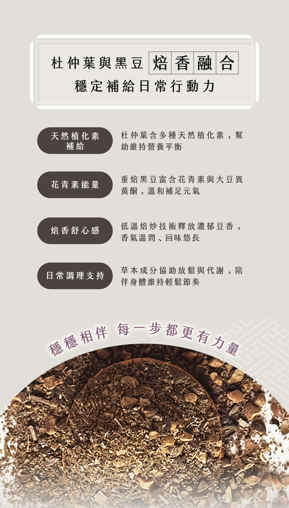 結合杜仲葉+重焙黑豆兩大草本,溫潤順口、香氣厚實,是養生族和久坐族的好朋友。 |