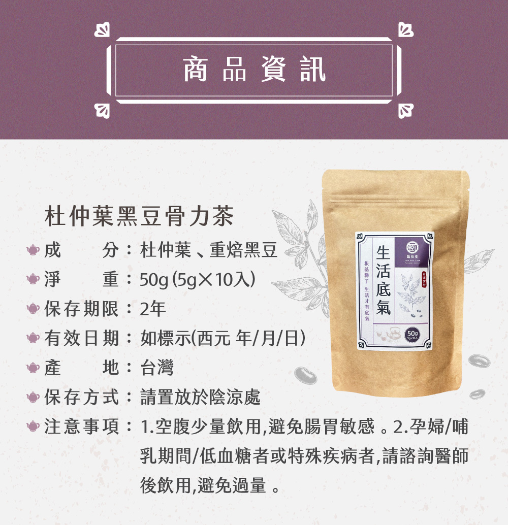 品牌:甄拾堂 品名:杜仲葉黑豆骨力茶 淨重:5g*10入 成分:杜仲葉、重焙黑豆 |