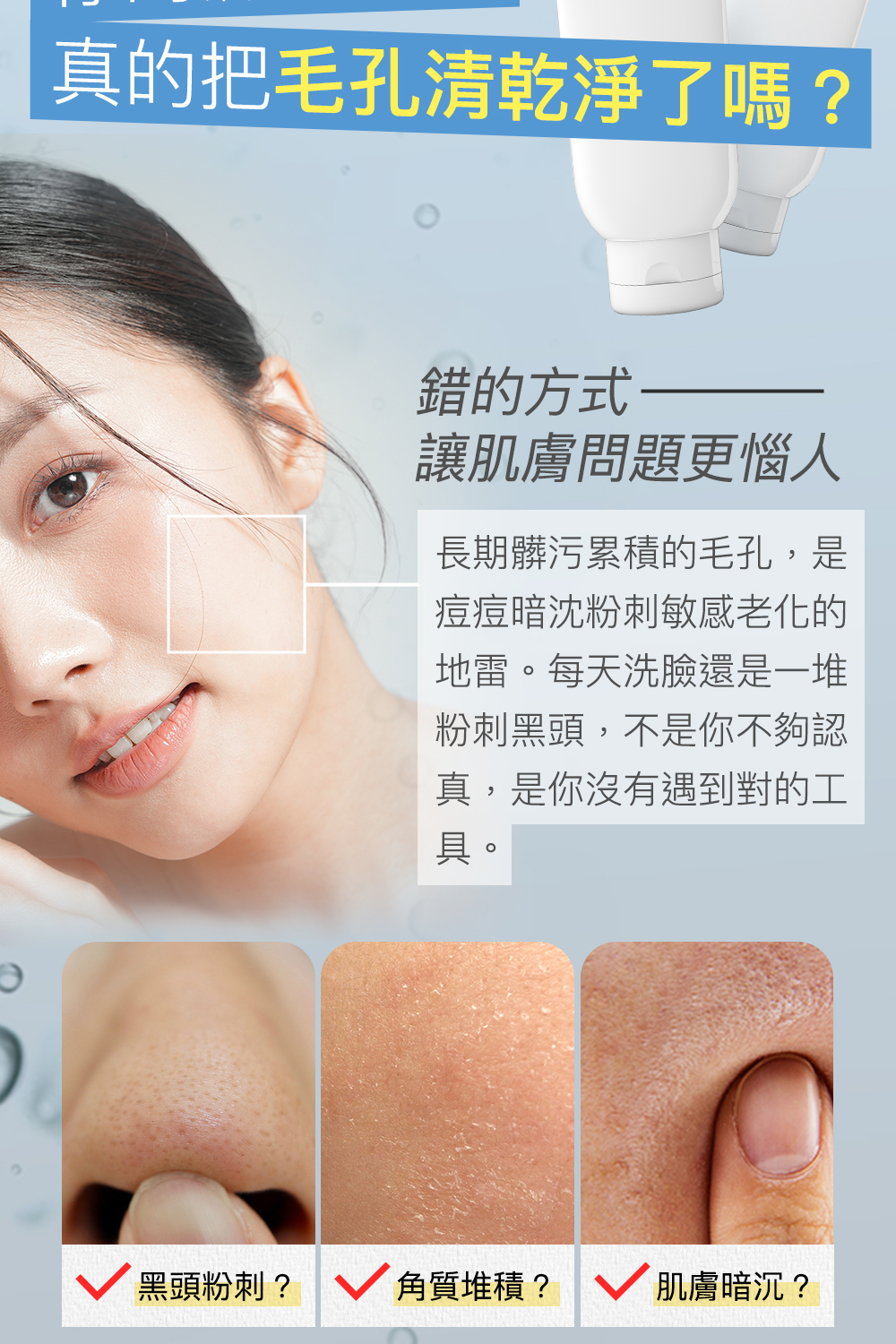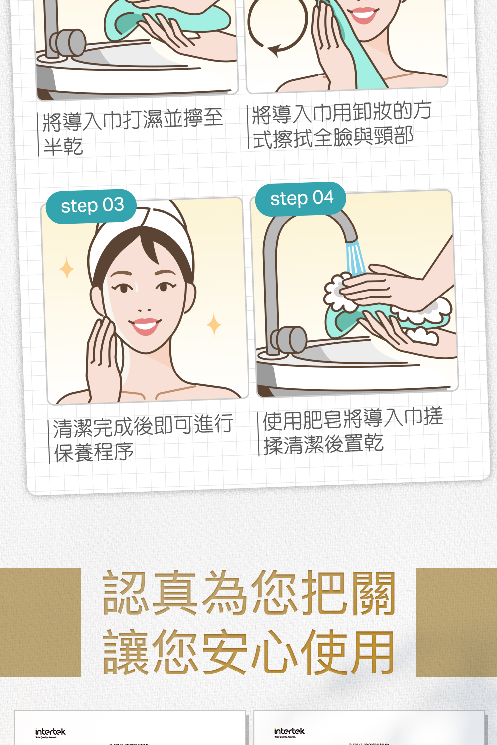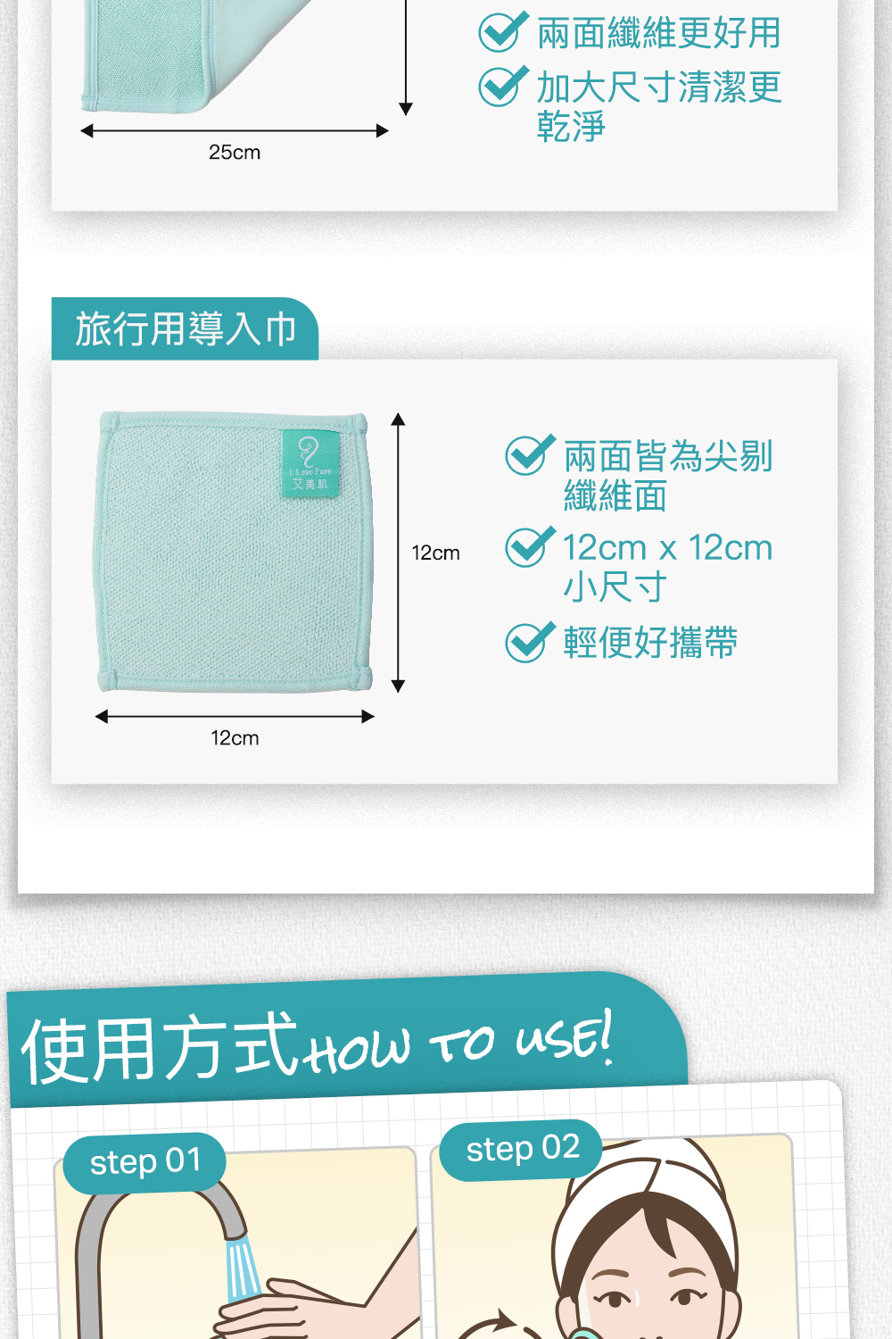 1.請用溫水將艾美肌完整打濕,稍微擠至「不滴水」狀態即可,不需擰到全乾,保持毛巾有水感,可提升滑順度與清潔力。 2.將巾體貼合肌膚,以畫圓方式輕柔擦拭,特別針對鼻翼、下巴、額頭等易出油部位加強清潔。 *亦可搭配洗面乳使用,將洗面乳擠到毛巾上,搓揉出泡泡後,輕輕擦拭肌膚 |