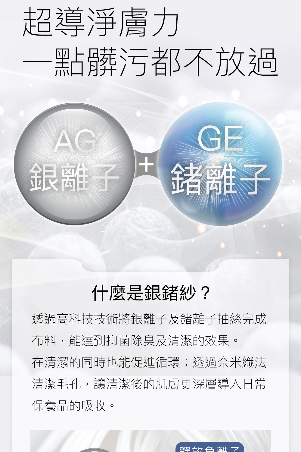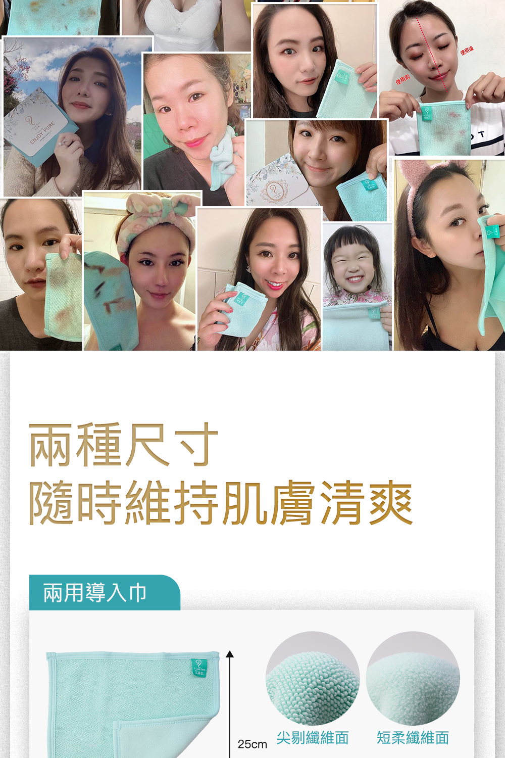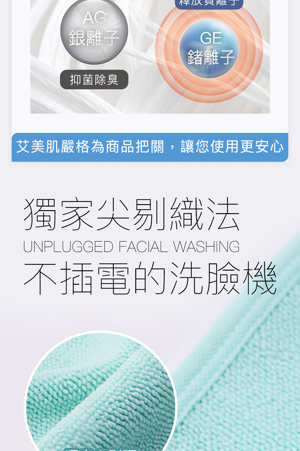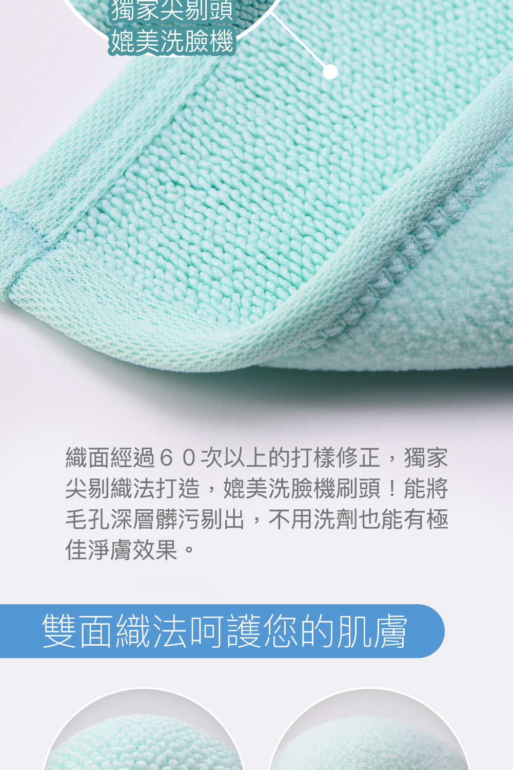 【 不插電洗臉機 】 ▫️台灣製25%銀鍺紗專利技術,有效釋出負離子,吸附毛孔正電髒污~粉刺掰掰 ▫️刷頭式纖維末端 × 超細纖維結構,有效深入毛孔,剔除帶出毛孔油垢及殘留 ▫️弄濕毛巾即可擦~取代卸妝液、去角質、洗面乳,無須化學洗劑也乾淨 ▫️不刺膚、不拉扯、不紅癢,柔軟纖維不傷肌膚屏障,敏弱肌也安心 #台灣紡織工藝 #獨家設計【尖剔毛端設計 × 超細纖維織法】 ✔️ 吸濕排汗運動紗 X 25%鍺銀紗 ✔️ 獨家毛尖式纖維末端 ✔️如同洗臉機刷頭可深入凹凸不平的肌膚紋理,剔除毛孔污垢 ✔️柔軟纖維更柔軟更貼膚,不刺激肌膚 ✔️鼻翼、嘴角、下巴細節處,能緊密貼合、深層清潔不放過! ✔️耐用6個月,可回收作為家居清潔使用 #使用高達25%純度99.9%銀塊和鍺離子製成的銀鍺絲 ✔️ 鍺實驗證明:蓄熱保溫加速代謝循環,小臉消水腫又美肌 ✔️ 負離子:利用正負相吸,將將帶正電的污垢導出,達到真正的深層清潔 ✔️ 銀離子:99.9%高純度,具有除菌除臭效果 |