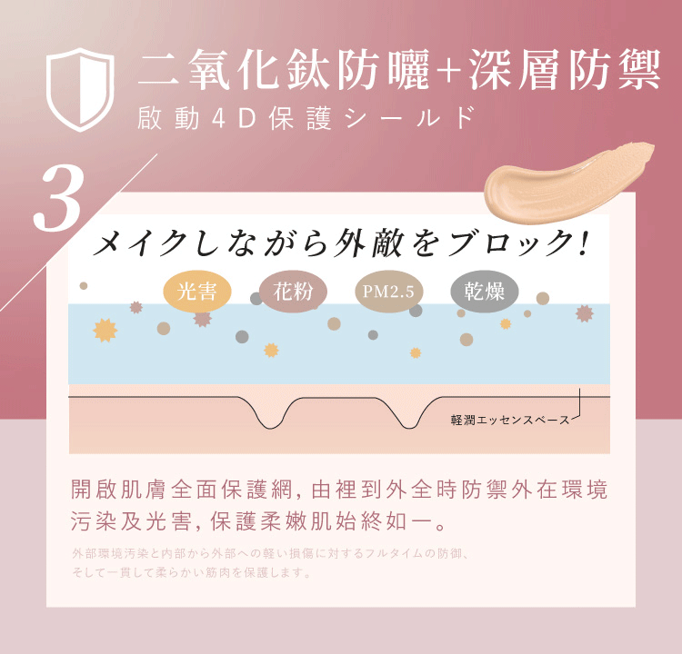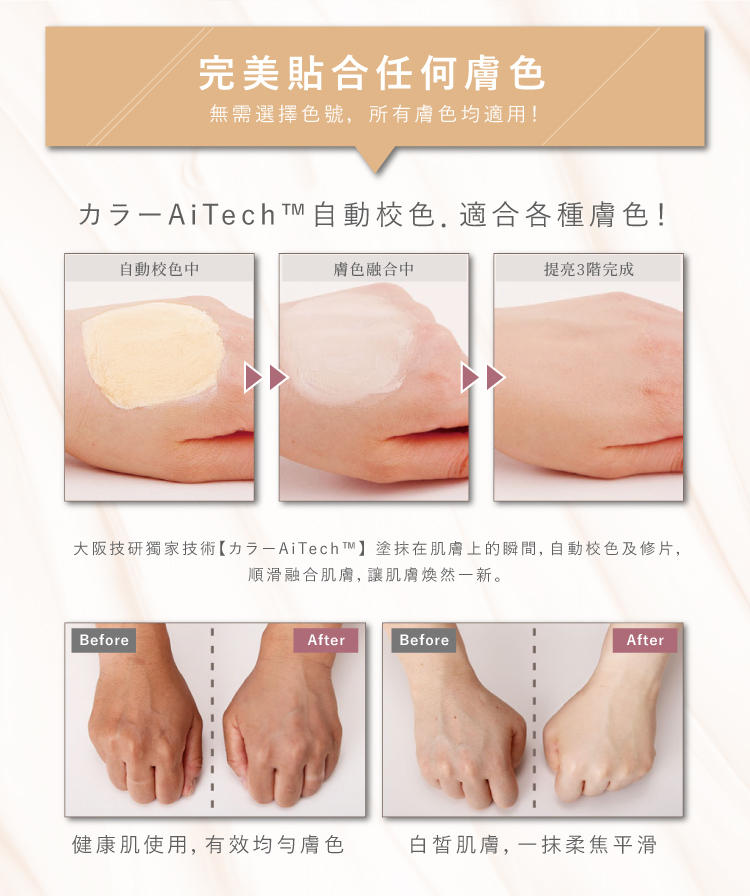 日本專為亞洲膚質設計的素顏呼吸DD霜,大阪技研獨家技術【カラーAiTech™】一抹色階提升,散發自信魅力光芒,任何膚色提亮3色階。【FAP羽量呼吸粉體フェザーエア】16H控油持妝,毛孔隱形不脫妝體!融合日本醫學保養配方「8MSE™」植物萃取核幹搭配8種小分子保養精華,上妝同時深層保養肌膚,物理防曬SPF35,全方位隔離環境傷害,完美濾鏡零妝感。 |