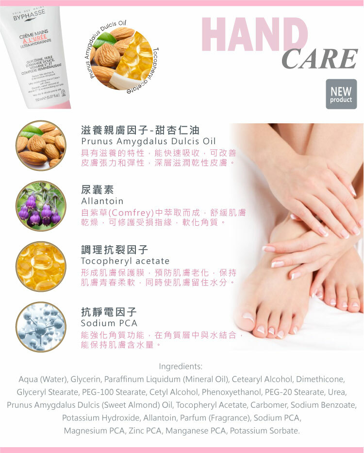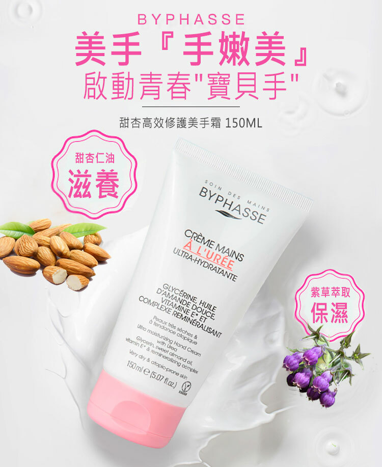 品牌:蓓昂斯 BYPHASSE 品名:甜杏高效修護美手霜 容量:150ml |