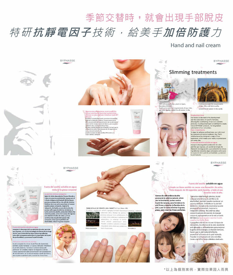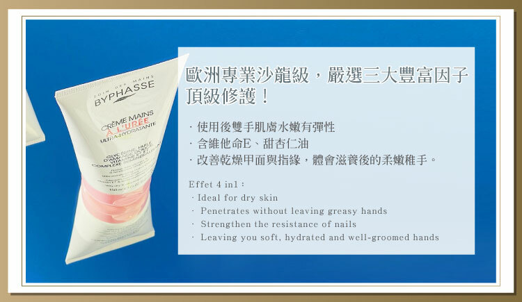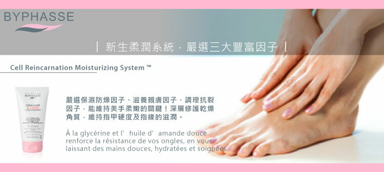 Byphasse蓓昂斯是歐洲七星級沙龍護髮護膚專業品牌,以專業人士的技術需求做為研發生產標準製造,是全球首屈一指的沙龍專業系列品牌。針對上班族常使用電腦手機/媽媽做家務的主婦手特研新複方技術:新生沁潤系統(保濕防燥+滋養親膚+調理抗裂), 瞬間達到絕美雙手的效果。 |