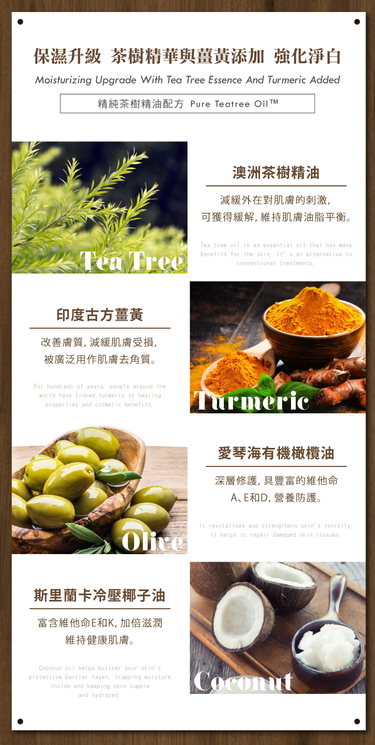 英國里茲純手工製作,保濕強化系統(Moisturizing strengthening system™)的天然保濕精華,加倍滋潤肌膚,精純茶樹精油配方(Pure Teatree Oil™),深層清潔與保養。 |