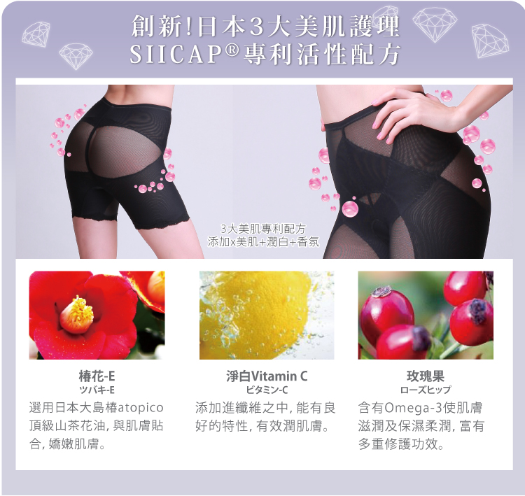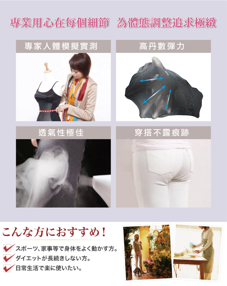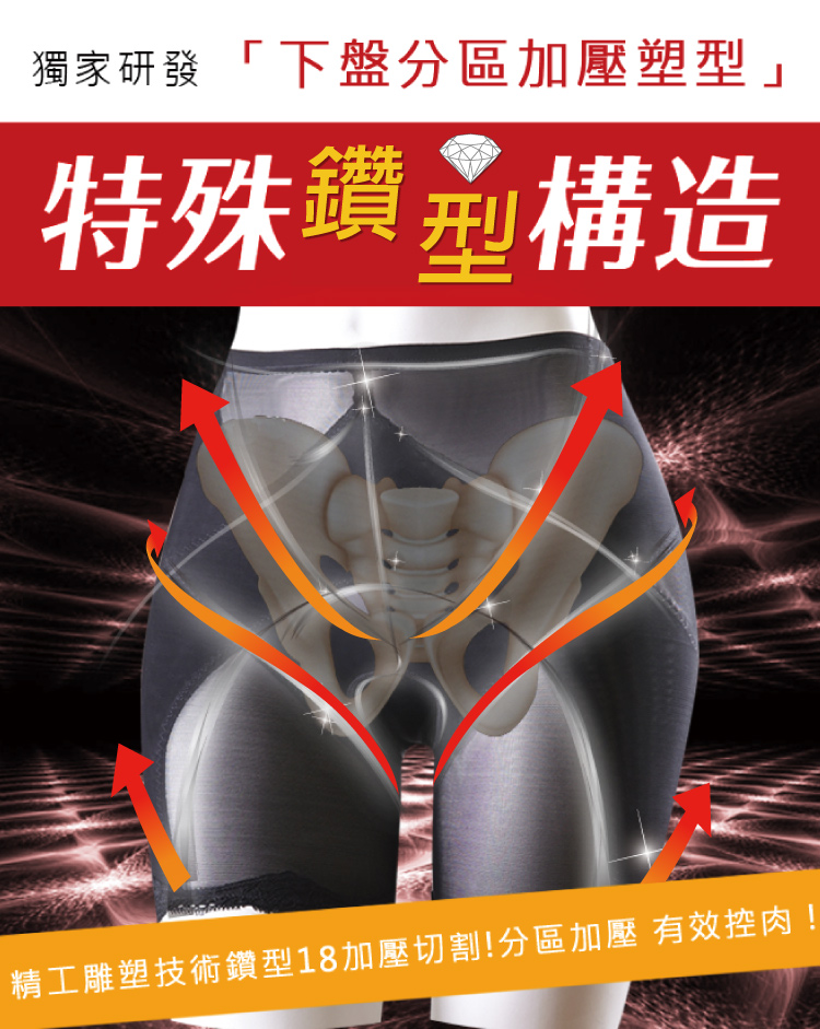 | 產品特色 | 鑽石切割剪裁法,立即完美下盤曲線,維持18歲美尻。3合一完型補整,一件3用:底褲、安全褲、補正褲。98.7%日本女性立即感受下盤補正實感。日本名模『正轉褲』?!搞定『大轉子』下身肥胖、腰痛、水腫、虛寒一次解決! |