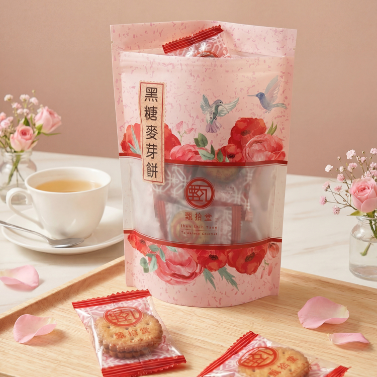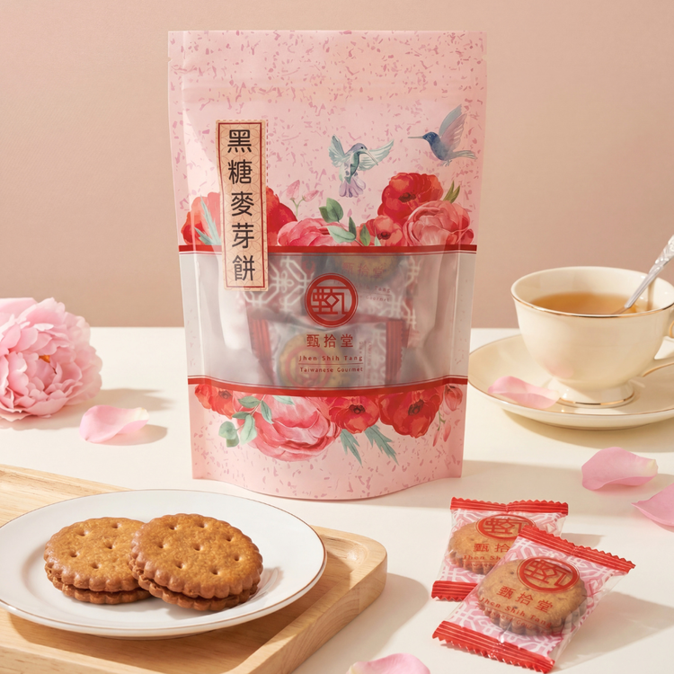 | 產品規格 | 品牌:甄拾堂 品名:黑糖麥芽餅輕享包 淨重:90g±5g 成分:麵粉、麥芽、黑糖、焦糖、棕櫚油、大豆油、鹽、碳酸氫銨、碳酸氫鈉 |