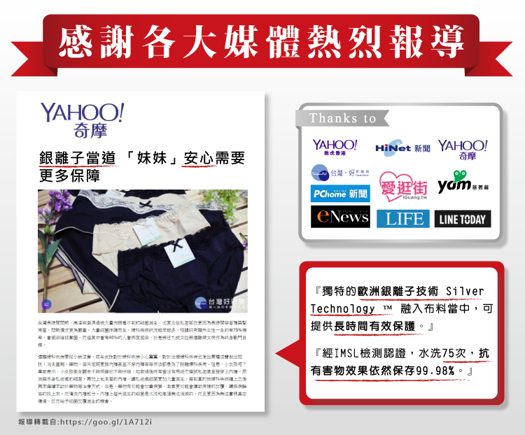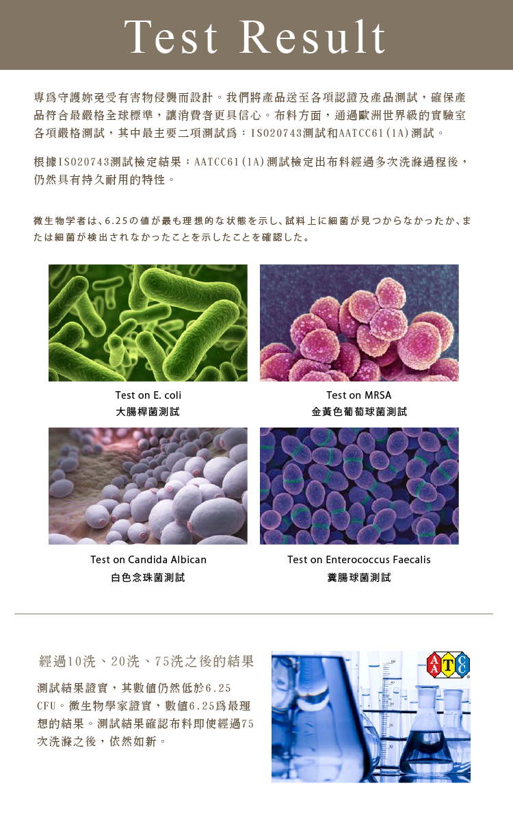 | 產品特色 | 歐規紡織技術+抗菌處理,遠離私秘困擾,獨特銀離子抗菌配方(anti-bacteria™)包覆整件褲體,有效防止細菌孳生,保健私密處、減少異味或搔癢,搭配天然有機棉,5%Spandex纖維,彈性佳,降低皮膚敏感,透氣又親膚。 |