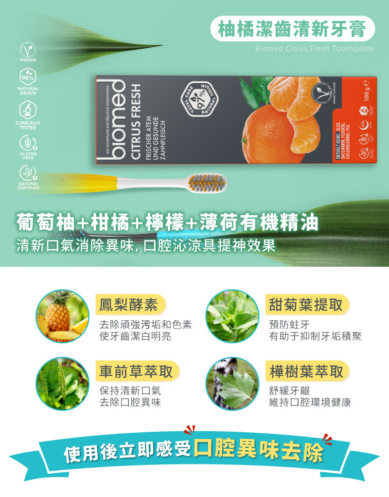| 產品規格 | 品牌:Biomed 品名:柚橘潔齒清新牙膏 容量:100g |