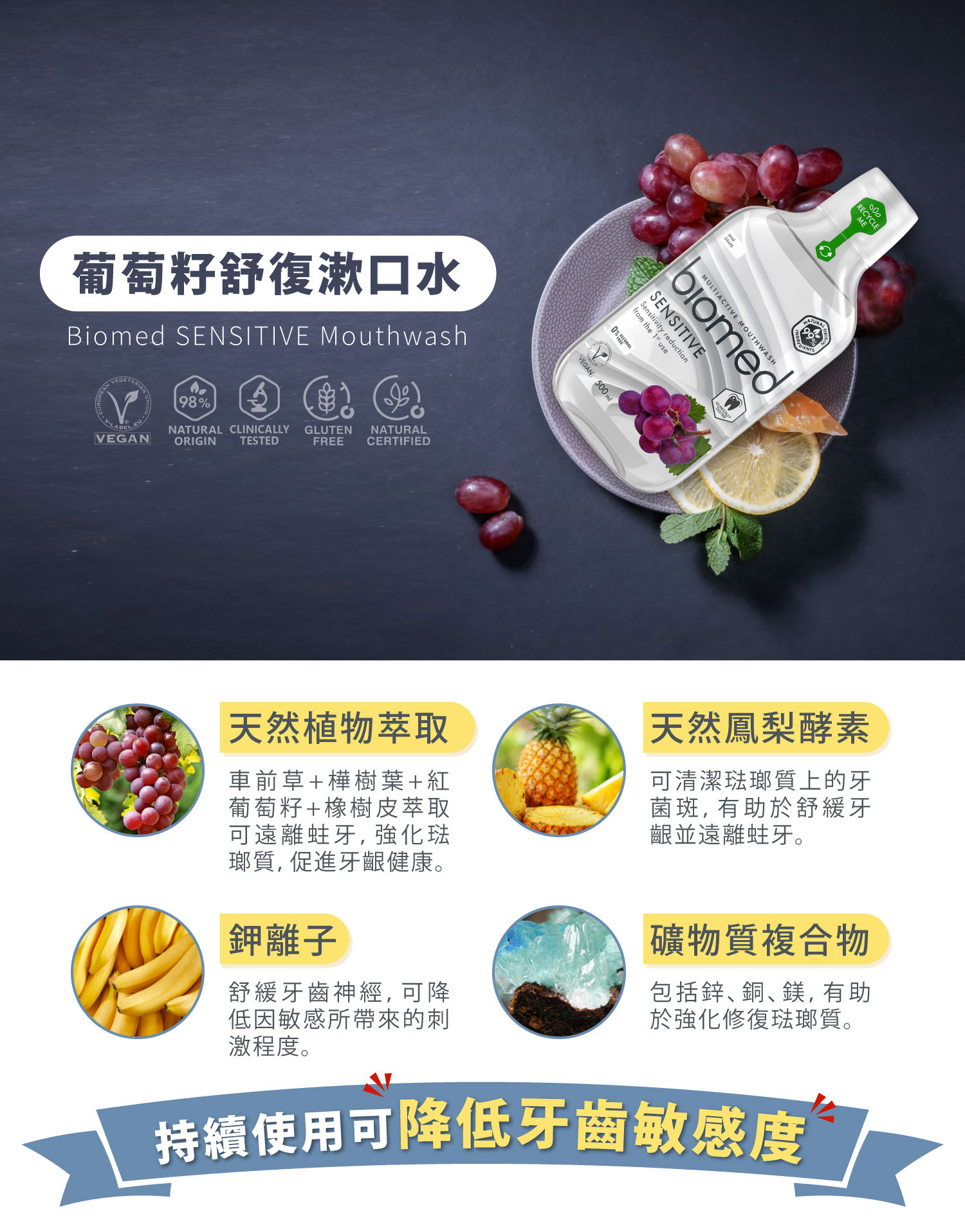 | 產品特色 | 以紅葡萄籽萃取為核心,搭配白橡樹皮、羊蹄草、白樺葉等多種植物配方,幫助清潔牙菌斑,維持牙齒與牙齦的健康狀態。配方中不含酒精、氟化物、SLES及氯己定,溫和不刺激,適合日常使用。添加葡萄糖酸鋅、檸檬精油及天然鳳梨酵素,有助於清新口氣與清潔牙齒表面污垢,維持口腔清潔與舒適。每天使用,為口腔注入植物系清新力。 |