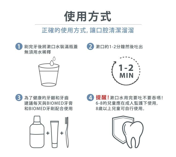 | 使用方式 | 配合刷牙後使用,將漱口水裝至瓶蓋漱遍口腔牙縫及牙齦後吐出。不需稀釋,漱口1分鐘可達最佳效果。6歲以上可使用,孩童建議在成人陪伴下使用。 |