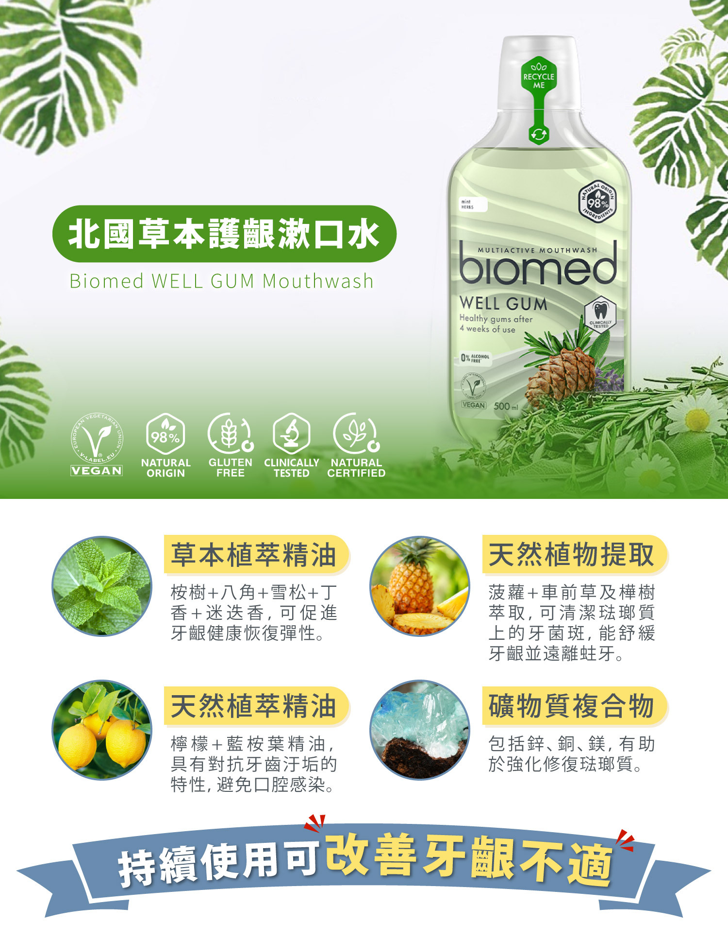 | 產品規格 | 品牌:Biomed 品名:北國草本護齦漱口水 容量:500ml |