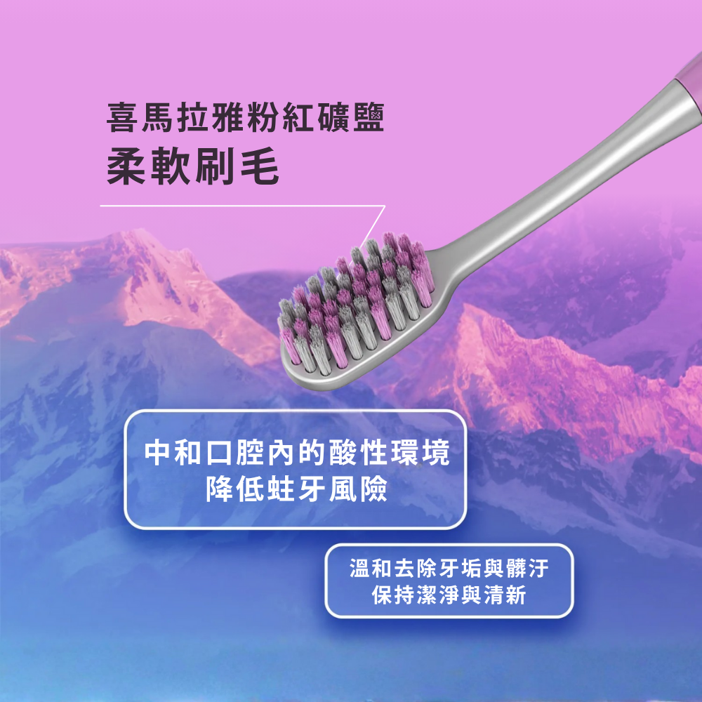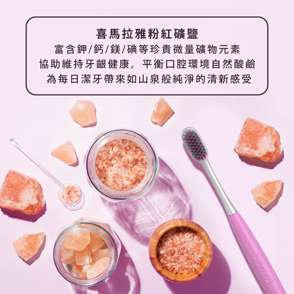 | 產品特色 | 特別添加喜馬拉雅粉紅鹽,富含鉀、鈣、鎂等天然礦物,有助於維持口腔pH平衡,提升整體清潔效果。搭配微米級刷毛,能深入牙縫細節,溫和刷除卡垢,不刮牙齦、不刺激口腔。特別適合容易堆積牙垢、追求深層潔淨,以及偏好天然成分護理的使用者。 |
