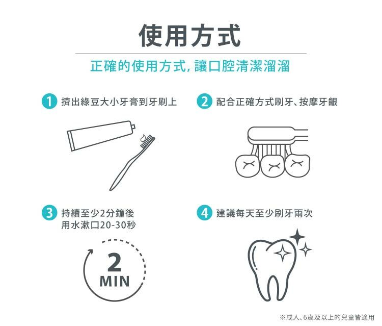 | 使用方式 | 取適量牙膏塗於牙刷,配合正確的刷牙方式進行口腔清潔,使用後請以清水漱口即可。 |