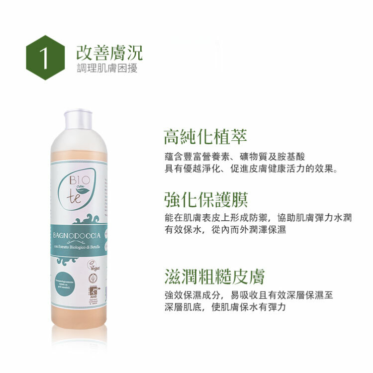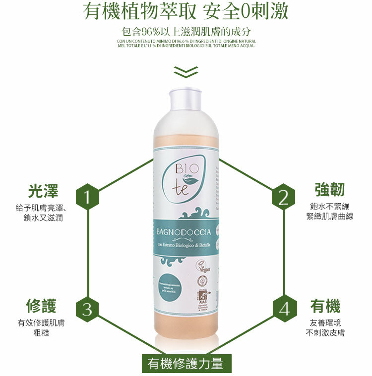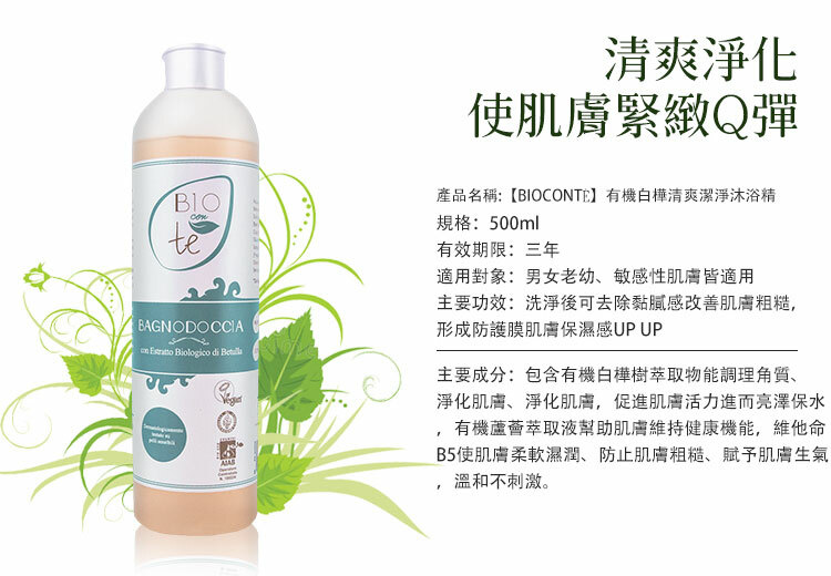 | 產品規格 | 品牌:BIOCONTE 品名:有機白樺清爽潔淨沐浴精 容量:500ml |