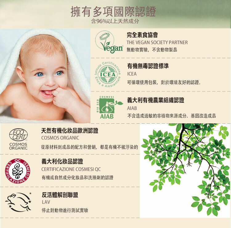 嚴選96.6%以上天然植萃,通過歐洲四大有機認證,安心潔淨無負擔。不含SLS、Parabens、皂鹼等刺激成分,寶寶肌、乾肌、敏弱肌也能安心使用。富含有機白樺、蘆薈與維生素原B5,溫和潔淨同時補水保濕,提升肌膚透明感與舒適度。每日沐浴就像沉浸在森林SPA,清爽無黏感,給肌膚最純粹的呵護。