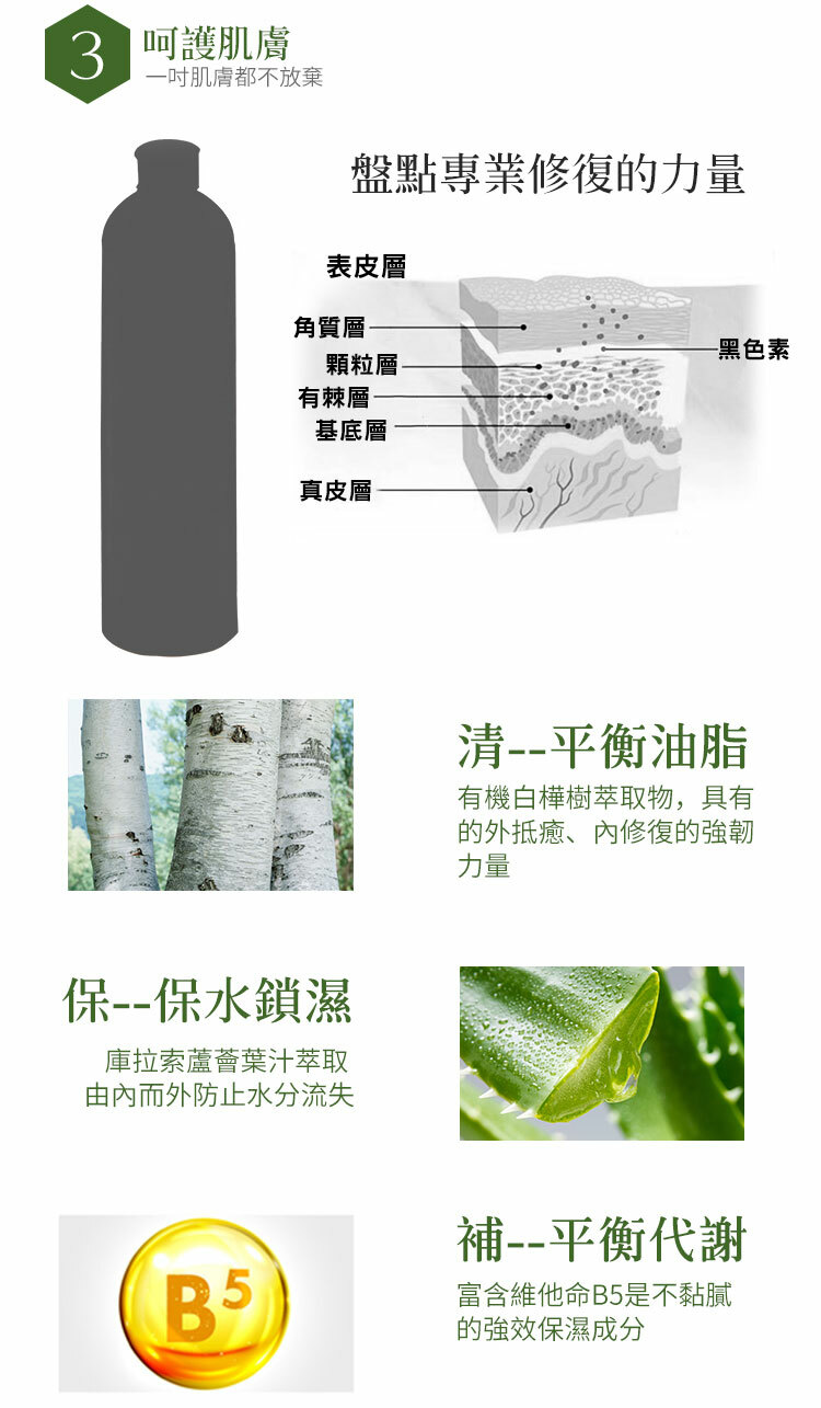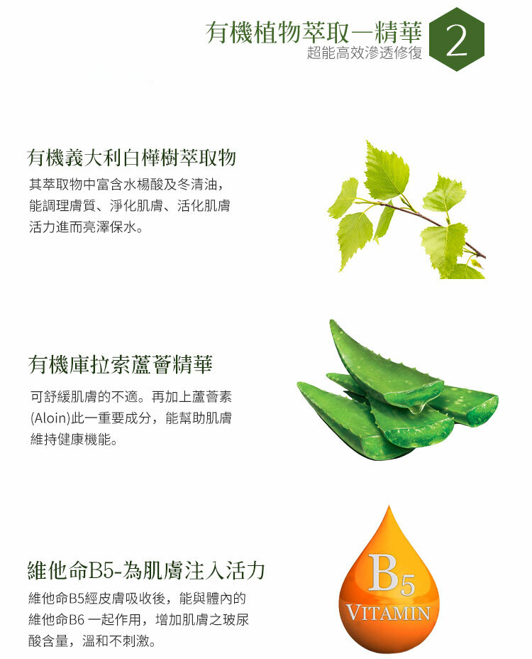 4.有機白樺樹萃取蘊含多種胺基酸和活性物質,提供肌膚保護層鎮靜紅腫不適,有效淨化肌膚