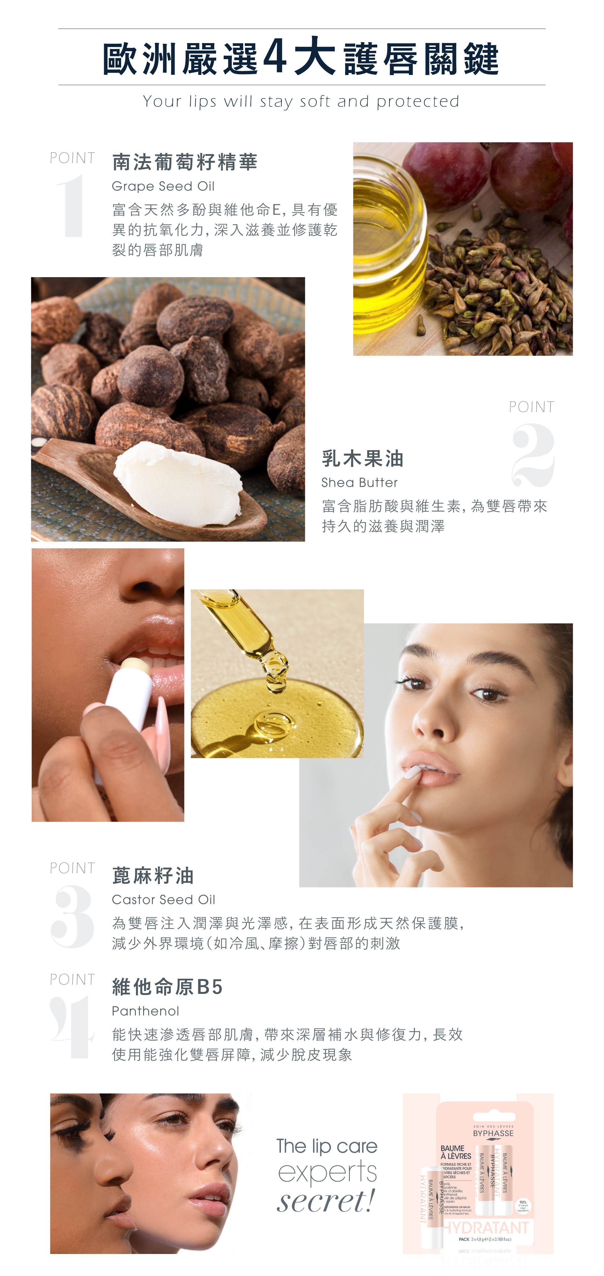 | 產品規格 | 品牌:蓓昂斯 BYPHASSE 品名:南法葡萄籽潤澤護唇膏2入組 容量:2入/4.8g |
