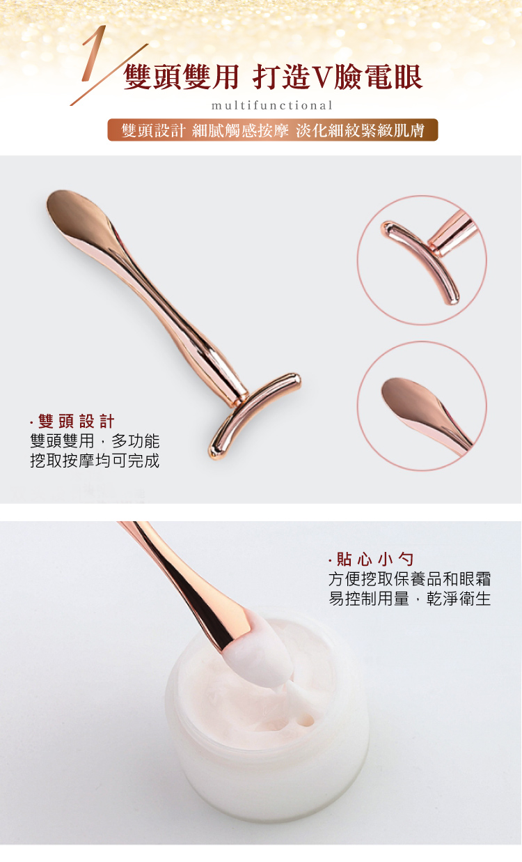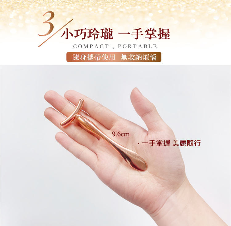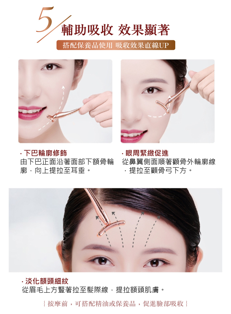 | 使用方式 | 以勺尾挖取適量保養霜或乳,並塗抹於欲按摩的肌膚區域。握緊手柄,利用美顏棒的橫槓部分,貼合肌膚,輕柔的由下往上,由內往外的方向滑動按摩。針對眼周或鼻翼旁等狹小部位,可以前端的圓頭輕輕按摩。亦可使用於手、足及身體其他部位,進行穴點按摩或推滑放鬆。 |