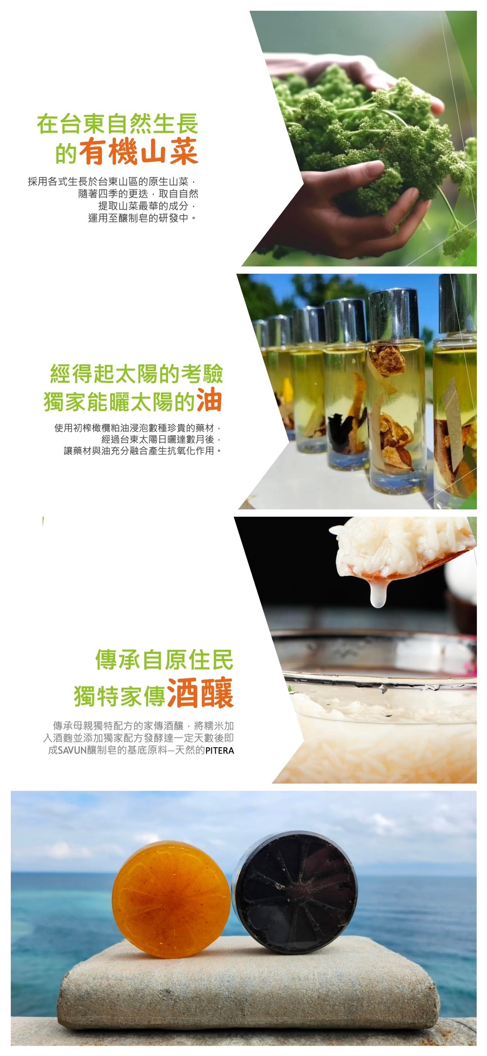 拒絕化學,崇尚天然! SAVUN,就是阿美族語中的「肥皂」,將自然的生命力注入日常清潔。成分純淨、無毒無害,保證健康與安心,遠離化學刺激,回歸自然的潔淨力量。溫和高效、永續環保,潔淨力強且不傷手、不軟爛,易沖洗、省水不污染,真正友善地球!