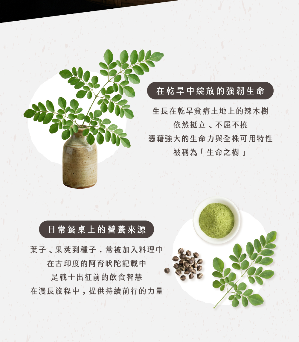辣木被稱為「植物界的綠色超級食物」又叫「生命之樹」營養超豐富。含有多種維生素、礦物質,是日常補給的好幫手! |